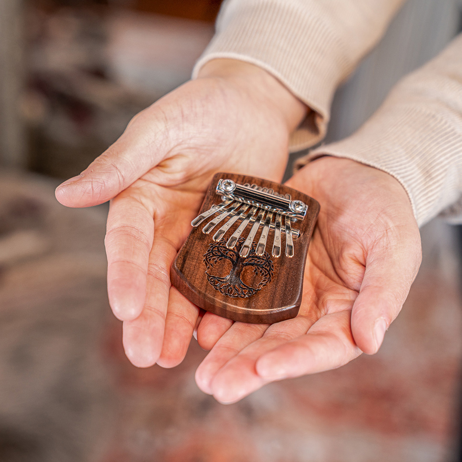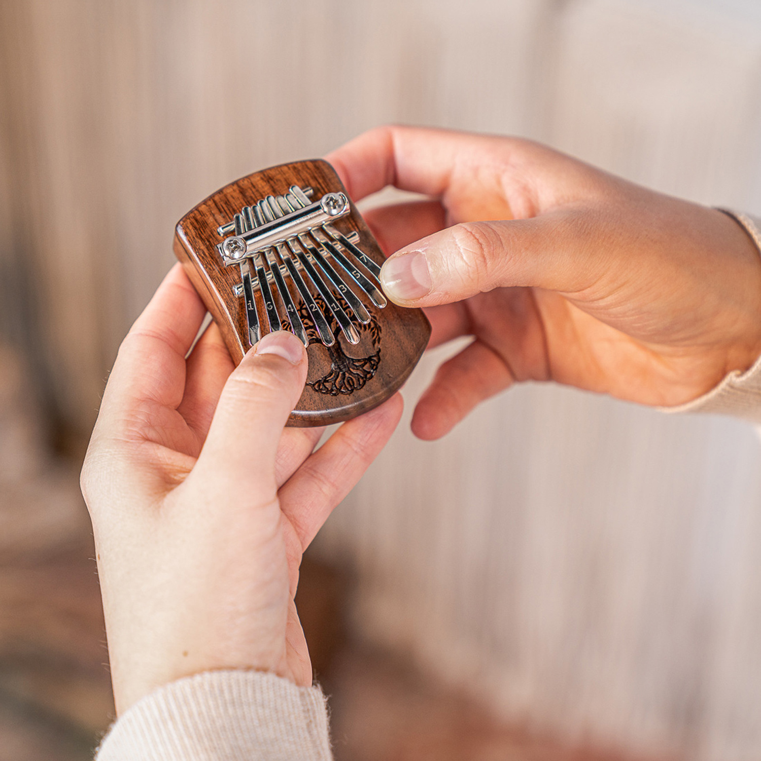 Aufgrund ihrer kleinen Größe kann die Mini Kalimba problemlos unterwegs mitgenommen werden und lässt sich leicht aufbewahren.