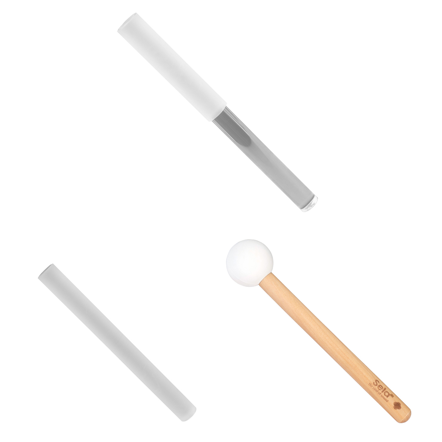 Im Set sind sieben Silikonringe enthalten, auf denen die Klangschalen platziert werden können. Diese Ringe ermöglichen eine optimale Schwingung der Schalen und tragen dazu bei, dass sich der Klang vollständig entfaltet. Zum Spielen der Crystal Bowls gehören zwei Silikonreiber, von denen einer halb und der andere vollständig mit Silikon ummantelt ist. Der mitgelieferte Schlägel mit einem Gummikopf und einem Griff aus Schima-Holz aus Asien ist angenehm zu halten und erlaubt es, die Klangschalen sowohl sanft anzuschlagen als auch zu reiben. Lieferumfang: