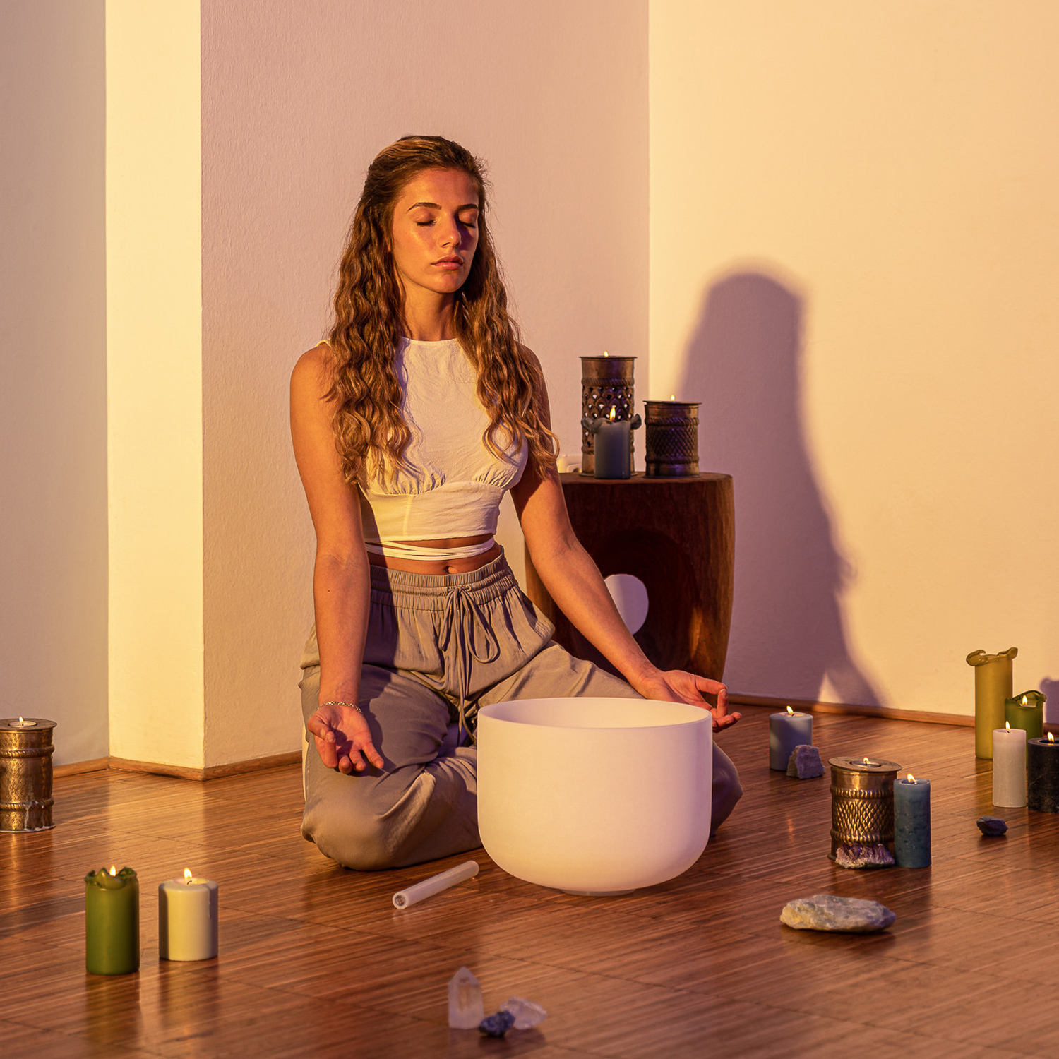 Beim sanften Anschlagen oder Reiben der Klangschale breitet sich ein lang anhaltender Ton aus, sodass die Energie in der gesamten Umgebung spürbar wird.