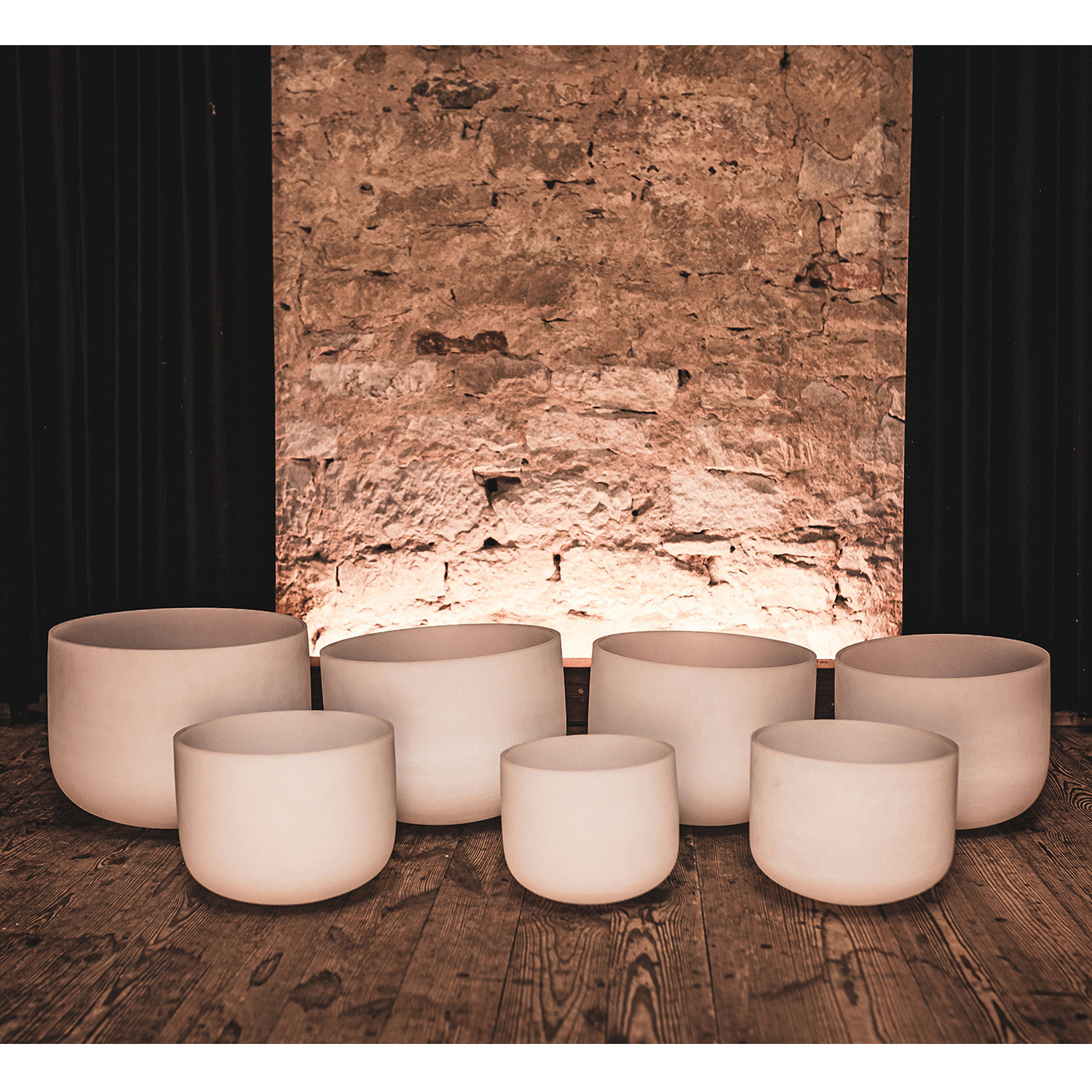 Das Kristallklangschalen-Set besteht aus sieben speziellen Klangschalen. Indem jede Schale auf ausgewählte Frequenzen und Töne gestimmt ist (Grundton: A4/a' mit 432 Hz), sollen bestimmte Energiepunkte des Körpers (sog. Chakras oder Chakren) besonders angesprochen und aktiviert werden. Dieses Set ist damit besonders für die spezifische Arbeit mit Chakren geeignet.- Wurzelchakra: Crystal Bowl CSB14C (14 Zoll, 35,56 x 35,56 x 26,5 cm), Ton C4