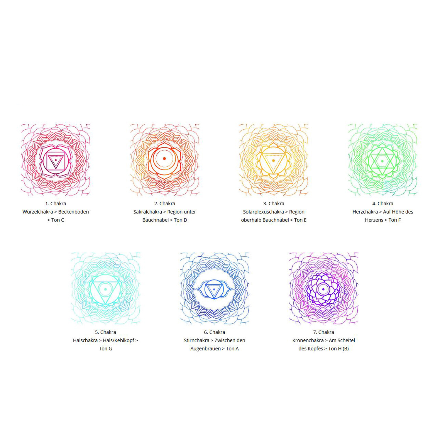Das Kristallklangschalen-Set besteht aus sieben speziellen Klangschalen. Indem jede Schale auf ausgewählte Frequenzen und Töne gestimmt ist (Grundton: A4/a' mit 432 Hz), sollen bestimmte Energiepunkte des Körpers (sog. Chakras oder Chakren) besonders angesprochen und aktiviert werden. Dieses Set ist damit besonders für die spezifische Arbeit mit Chakren geeignet. - Wurzelchakra: Crystal Bowl CSB14C (14 Zoll), Ton C4