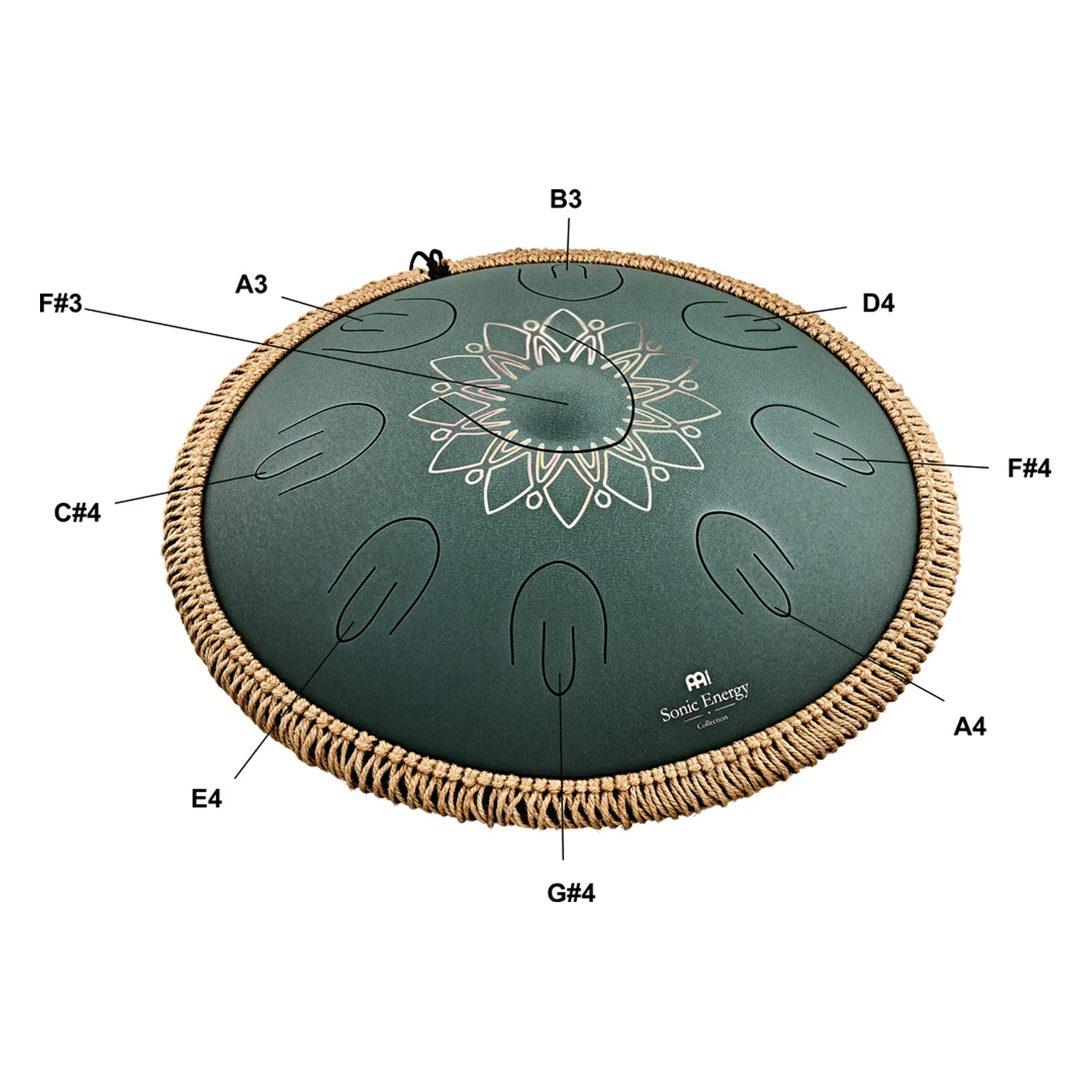 Das besondere Merkmal dieser Zungentrommel ist ihre innovative Zwei-Oktaven-Stimmung: Neben der zentralen Bassnote in der Mitte verfügt sie über acht weitere Tonfelder, die jeweils mit zwei Ton-Zungen ausgestattet sind und den jeweiligen Ton in zwei Oktaven erklingen lassen. Dadurch entsteht ein voller, obertonreicher Klang mit beeindruckender Tiefe und Resonanz. Die Stimmung umfasst die Noten A3, B3, C#4, D4, E4, F#4, G#4 und A4 - eine vollständige Fis-Moll-Skala, die zu melancholischen, aber auch hoffnungsvollen Melodien einlädt.