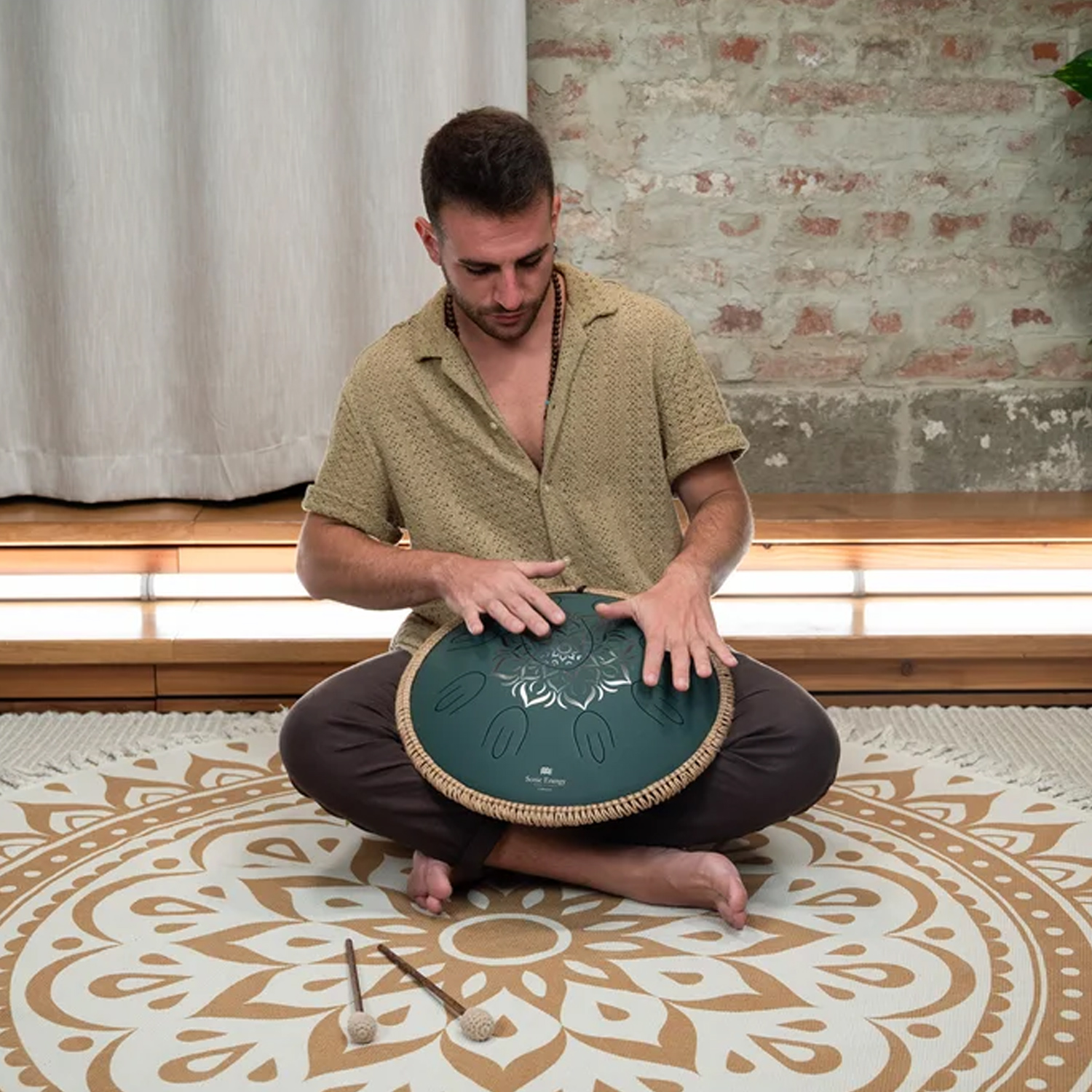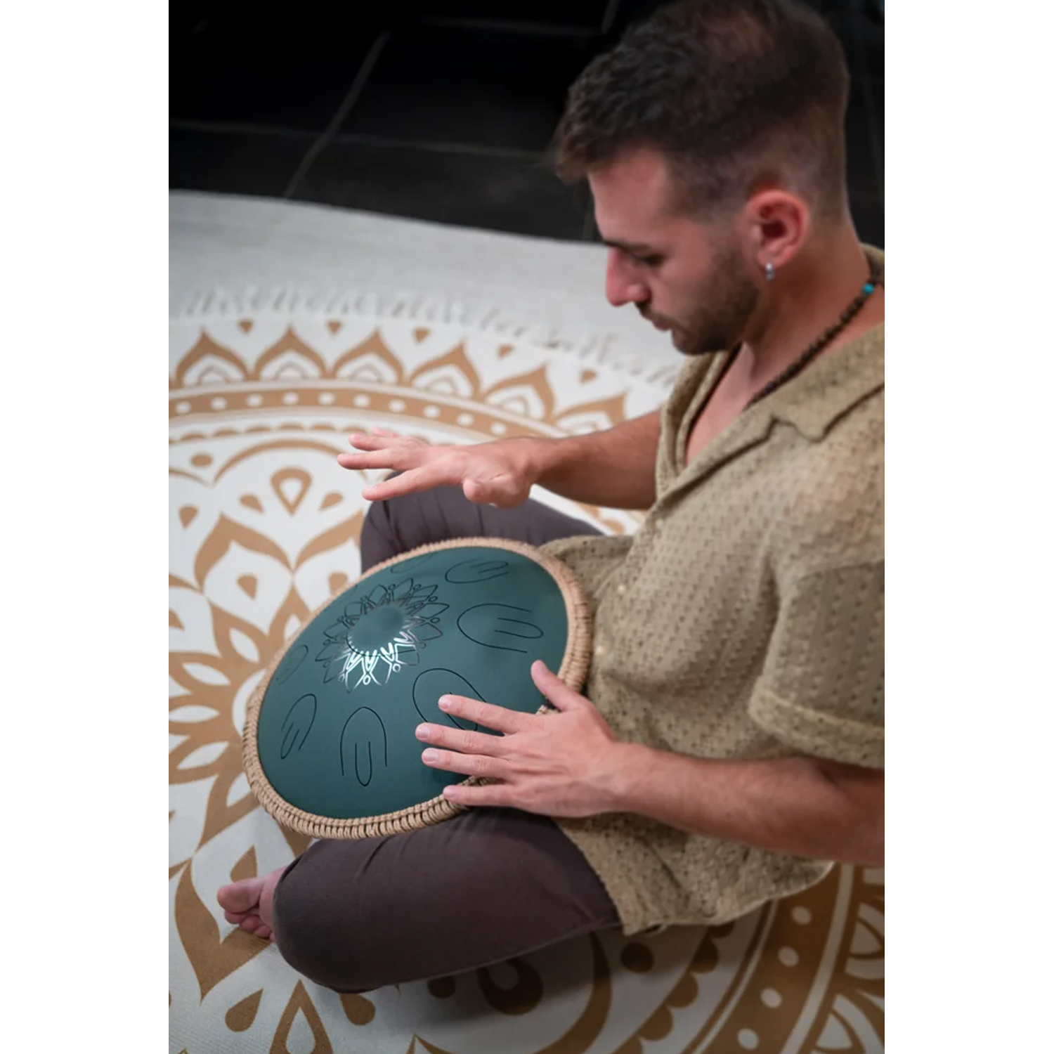 Das dunkelgrüne Finish mit der elegant gravierten floralen Verzierung und der dekorativen Leinen-Nylon-Kordel verleiht der Trommel eine edle, natürliche Optik. An der Unterseite befindet sich das Klangloch, das mit einem mitgelieferten Silikonstopfen verschlossen werden kann, um den Klang kompakter und fokussierter zu gestalten. Drei rutschfeste Silikonfüße sorgen für einen sicheren Stand auf jeder glatten Oberfläche und verhindern ungewolltes Verrutschen während des Spiels.
