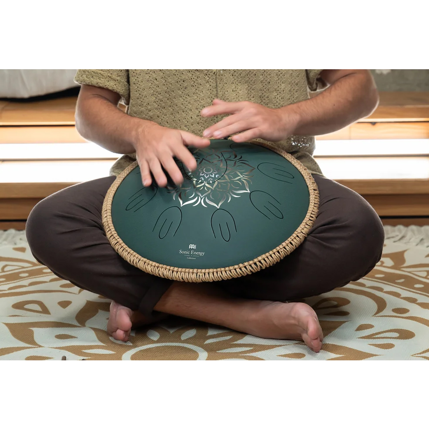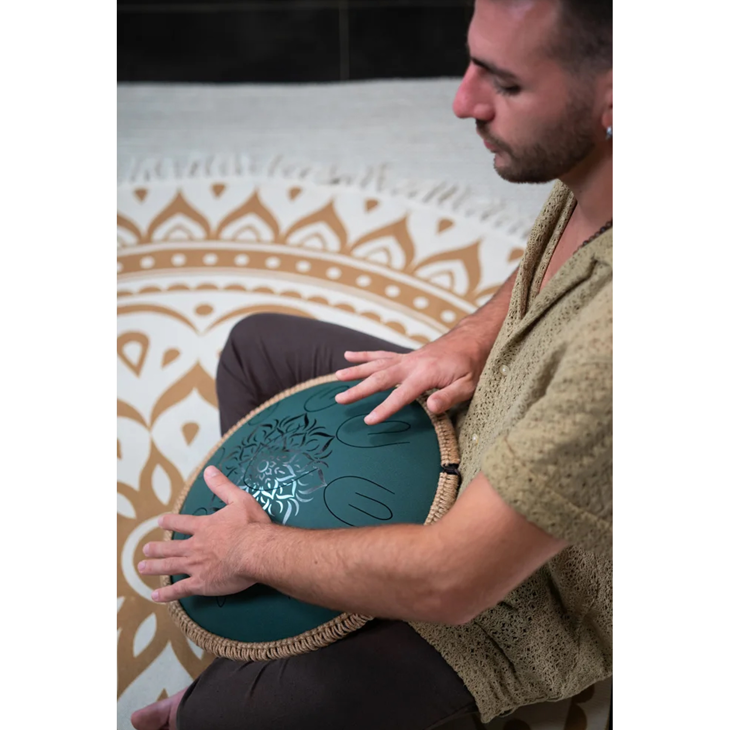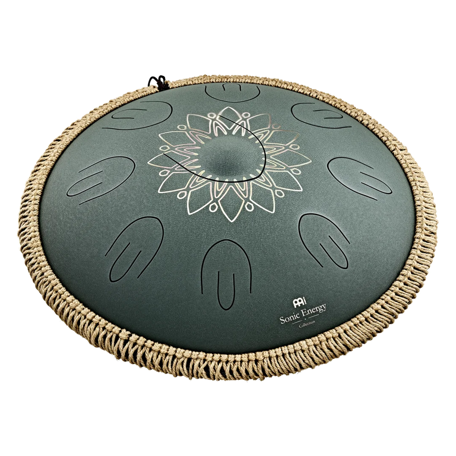 Das dunkelgrüne Finish mit der elegant gravierten floralen Verzierung und der dekorativen Leinen-Nylon-Kordel verleiht der Trommel eine edle, natürliche Optik. An der Unterseite befindet sich das Klangloch, das mit einem mitgelieferten Silikonstopfen verschlossen werden kann, um den Klang kompakter und fokussierter zu gestalten. Drei rutschfeste Silikonfüße sorgen für einen sicheren Stand auf jeder glatten Oberfläche und verhindern ungewolltes Verrutschen während des Spiels.