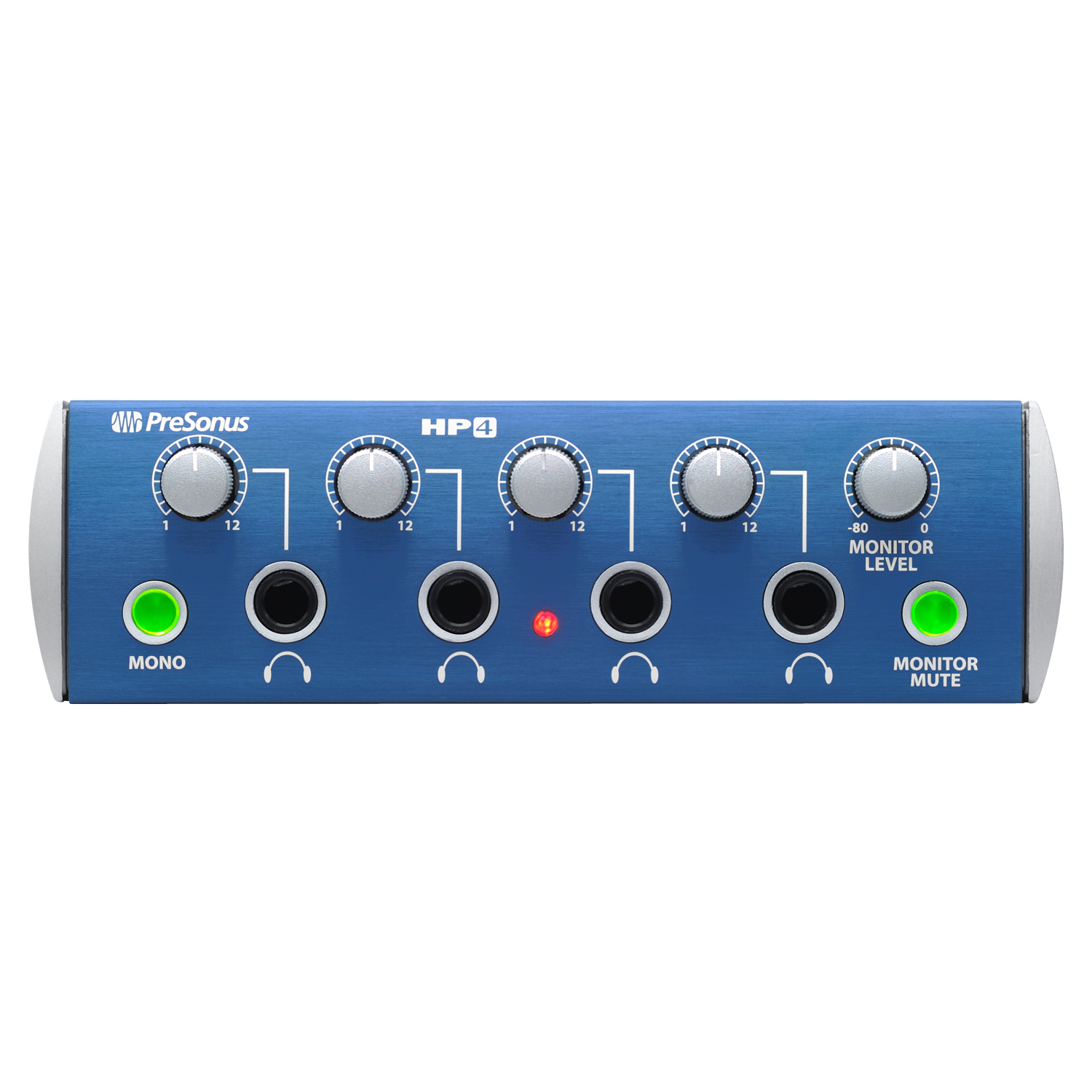 Der Presonus HP-4 ist ein vierkanaliger Kopfhörerverstärker mit professioneller Ausstattung in einem kleinen formschönen Gehäuse zu einem sensationellen Preis. Alle Ein- und Ausgänge des Presonus HP-4 sind als 6,35mm Klinkenbuchsen ausgeführt und können sowohl symmetrisch wie auch unsymmetrisch belegt werden. Der HP4 ermöglicht das Monitoring von Audioquellen über Kopfhörer. Mit seinen vier unabhängigen Kopfhörerausgängen können mehrere Personen gleichzeitig dasselbe Audio-Signal hören. Der Monoschalter auf der Frontseite des Presonus HP-4 schaltet die Eingangssignale Links/Rechts monophon auf alle Kopfhörerbuchsen auf der Frontseite. Jeder der vier Kopfhörerausgänge des Presonus HP-4 besitzt eine Ausgangsleistung von 150mW und verfügt über einen eigenen Lautstärkeregler. Das Eingangssignal lässt sich ebenso über den Monitorausgang des Presonus HP-4 auf die Studiolautsprecher routen und getrennt regeln, bzw. durch die Monitor Mute Funktion komplett abschalten. Der HP4 bietet eine klare und präzise Klangwiedergabe mit minimalem Rauschen und Verzerrungen. Versorgt wird der Presonus HP-4 durch das mitgelieferte Steckernetzteil.