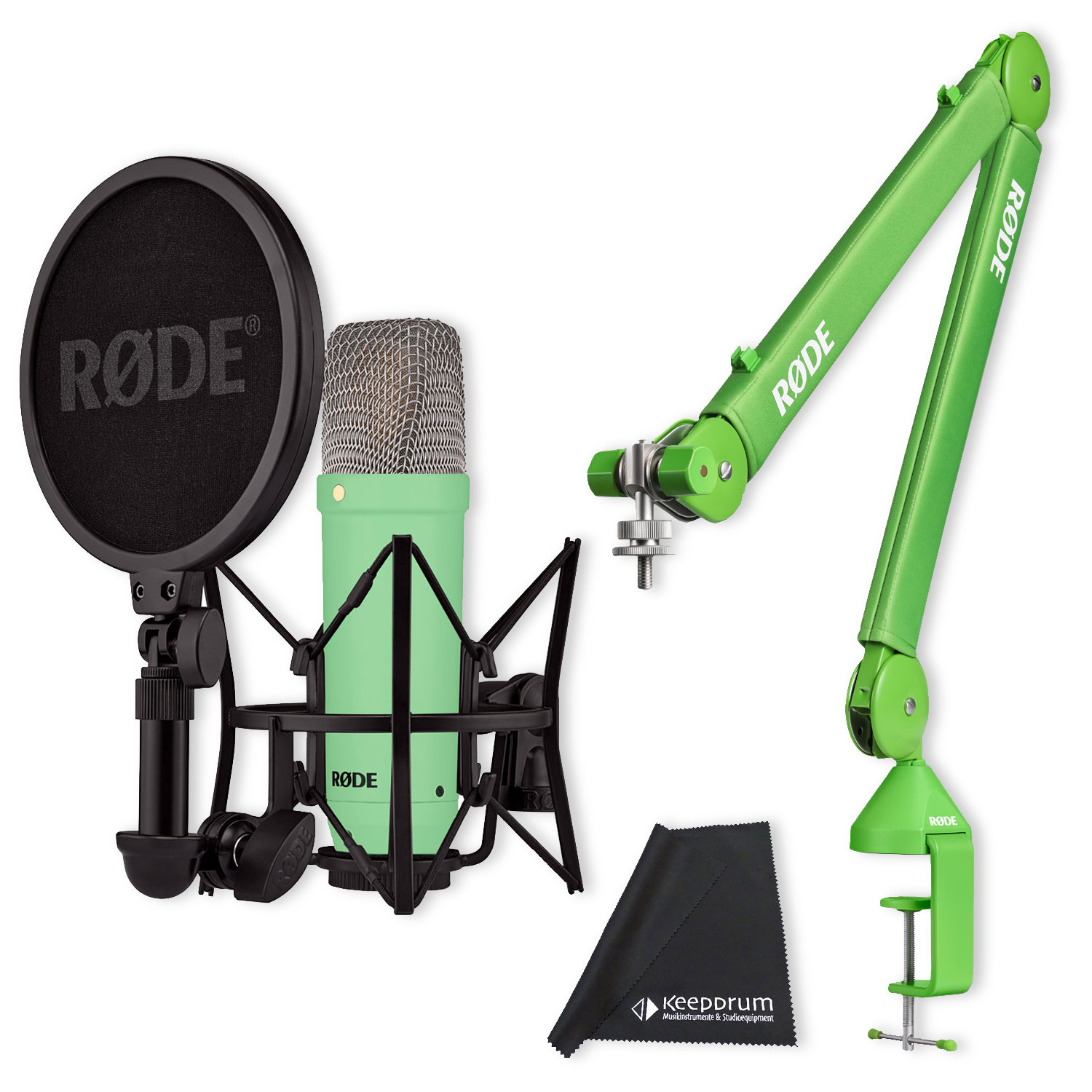 Rode Mikrofon NT1 Signature Grün mit PSA1+ Gelenkarm Grün und Mikrofasertuch