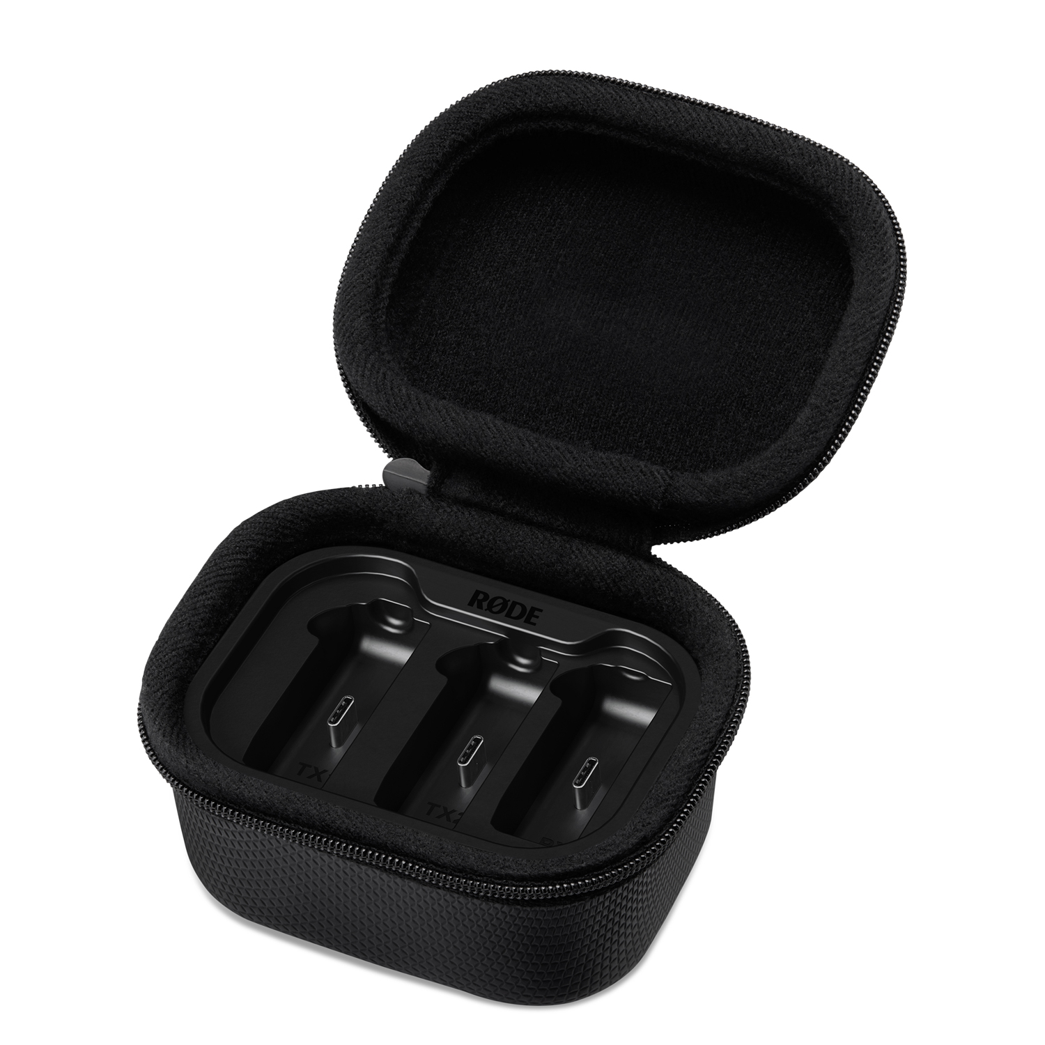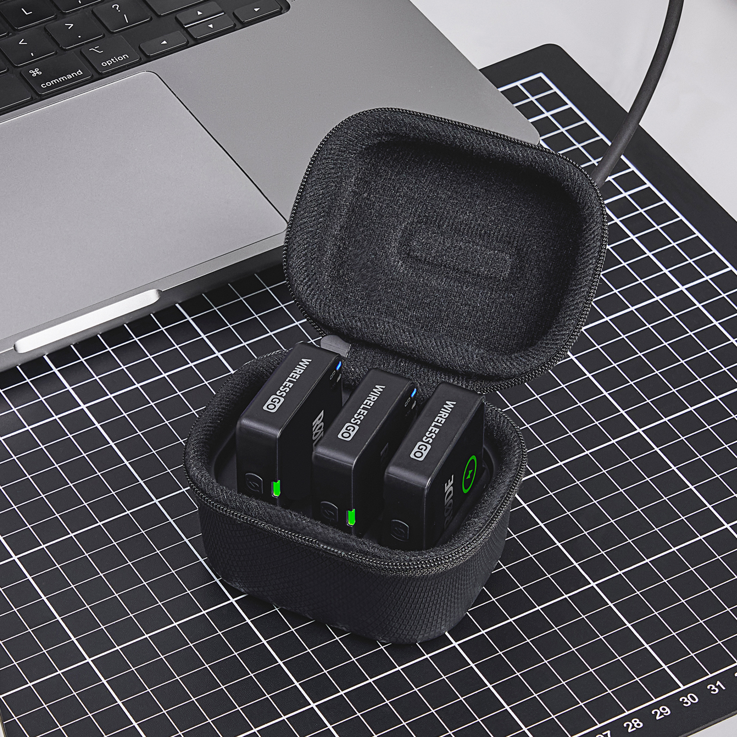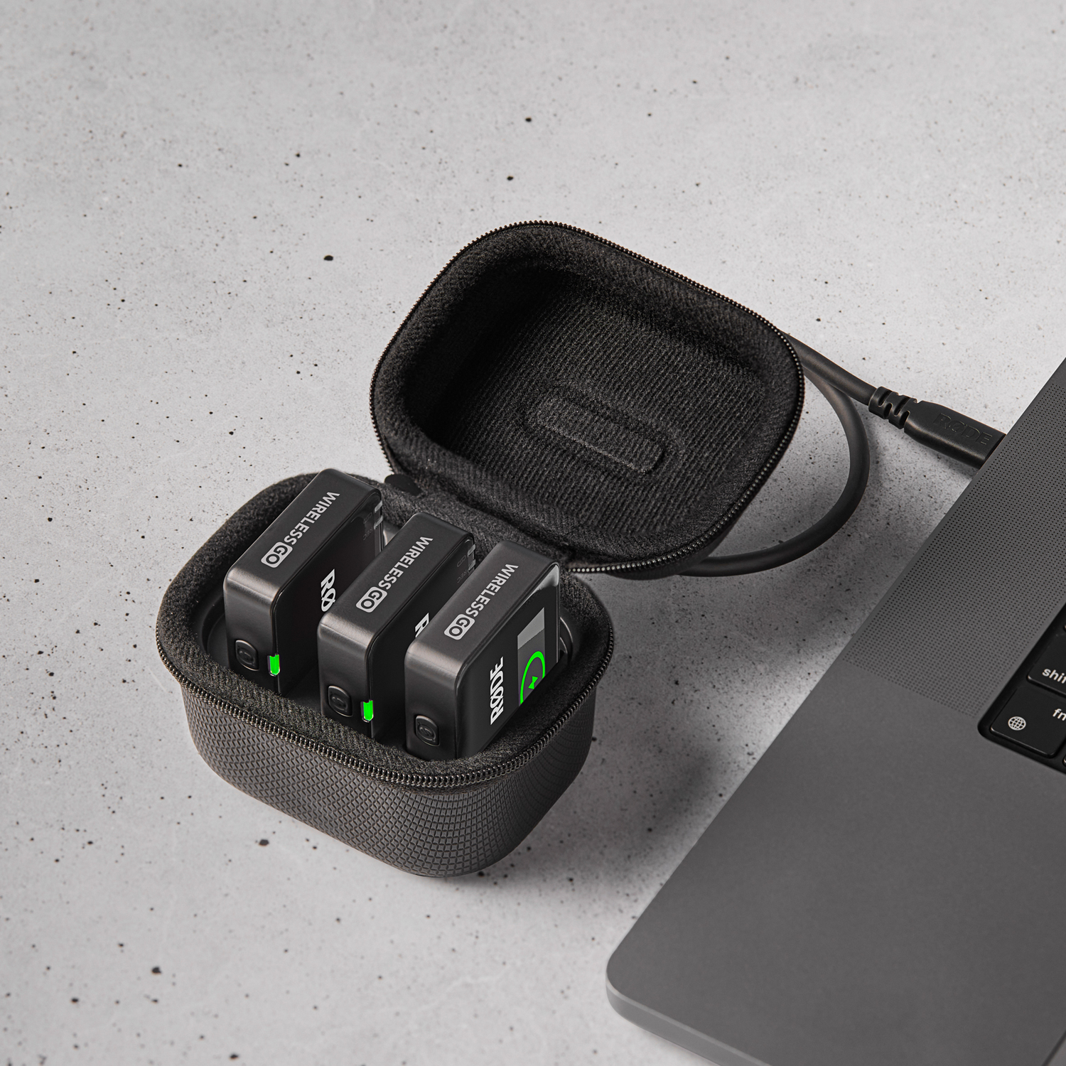 robustem, widerstandsfähigem Material gefertigt und bietet dank seines durchdachten Designs ausreichend Platz für das Wireless GO Gen 3. Darüber hinaus ermöglicht das Ladecase eine