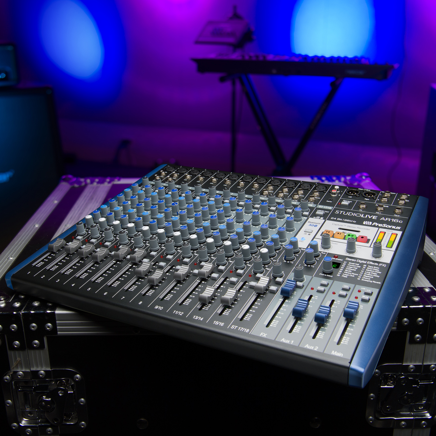 Weitere Features des StudioLive AR16C sind zwei Mono- und zwei Stereokanäle mit jeweils separaten Gain-Reglern, Panorama-Regelung und einem PFL-Solo-Schalter, was eine präzise Kontrolle über das Mischverhältnis bietet. Des Weiteren hat das Pult ein digitales Effektgerät - es kommt mit 16 Presets, welche man, mit einem Poti, auswählt und aktiviert. Die Effekte sind unter anderem Reverbs, Delays, Hall, und Chorus, die jedem Mix eine zusätzliche Dimension verleihen.