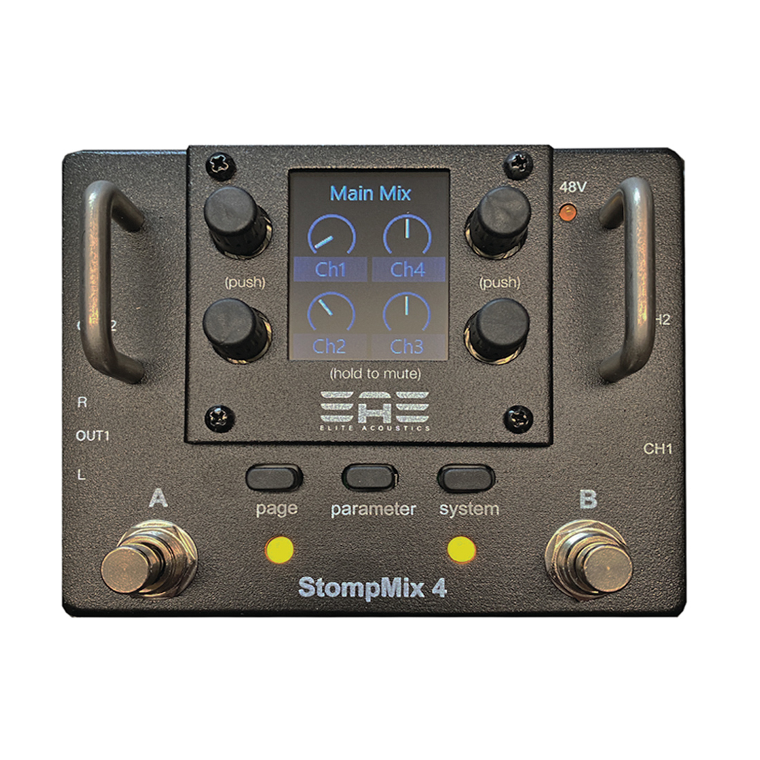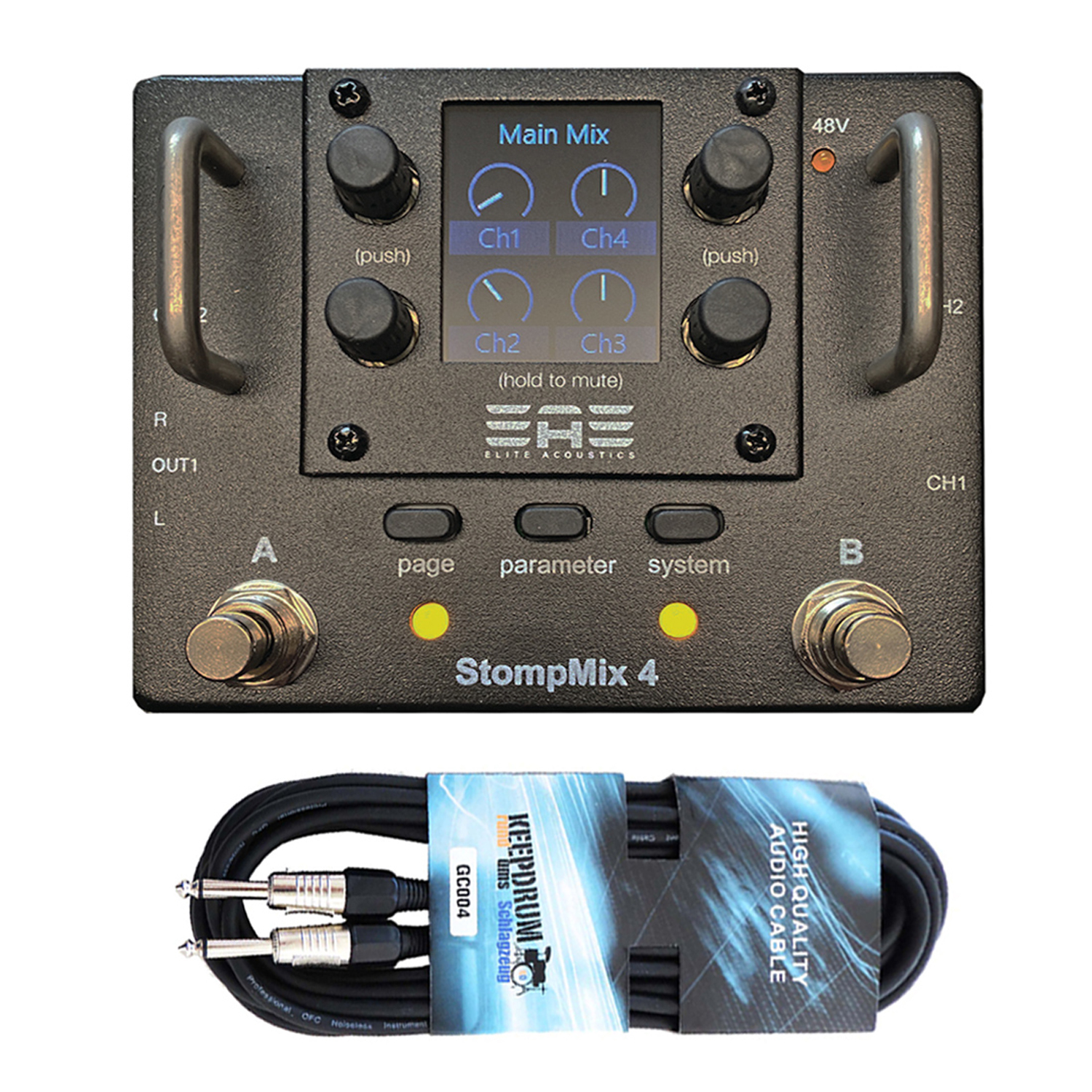 Der Elite Acoustics Stompmix X4 ist ein Digitalmixer in Pedalbauweise. Der Stompmix X4 verbindet die Vorteile einer Stompbox mit den Vorteilen einer programmierbaren Mischeinheit.