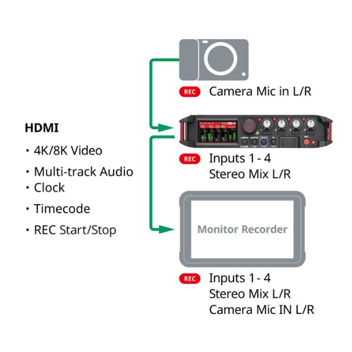 Durch Anschluss des FR-AV4 per HDMI an eine Kamera erreichen Sie eine präzise Video-Audio-Synchronisierung. Der FR-AV4 kann dadurch die Aufnahme automatisch starten und stoppen, sobald die Kamera dies tut.