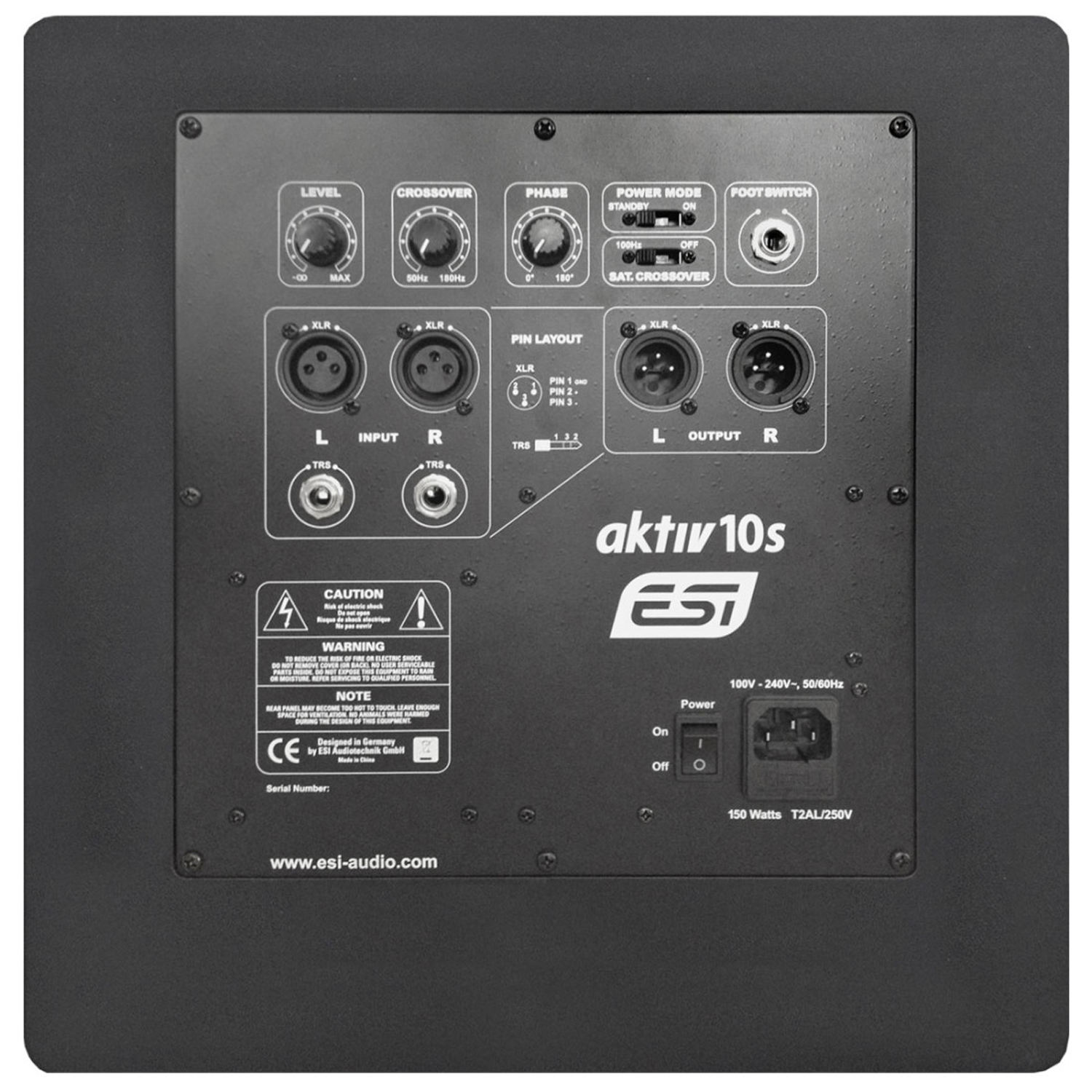 Der Aktiv10s verfügt über zwei symmetrische XLR- und unsymmetrische 6,3mm Klinken-Eingänge (jeweils L/R). Als Ausgänge stehen symmetrische XLR-Ausgänge zur Verfügung (L/R).