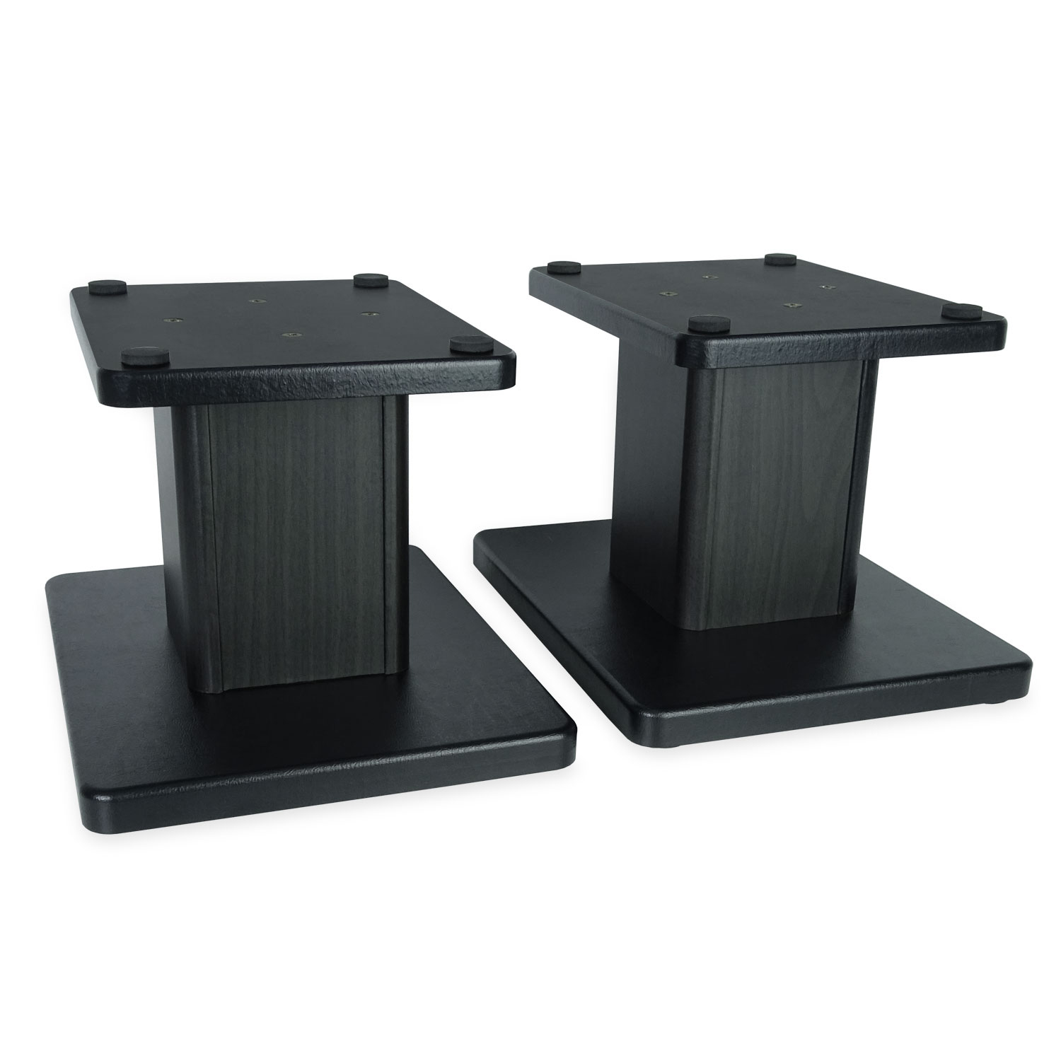 Als Material für die Ständer wurde MDF (mitteldichte Holzfaserplatte) gewählt. Dies ist ein beliebtes Material für Akustik-Elemente, da es durch seine hohe Dichte und Stabilität eine sehr gute Schallabsorption bietet. Das Gewicht von 2250g je Ständer wirkt sich dabei ebenso positiv aus wie die 20mm starke Basisplatte. Die zusätzlichen Moosgummi-Pads an Boden- und Auflageplatte der Boxenständern sorgen dazu für eine effektive Dämpfung ungewollter Vibrationen.