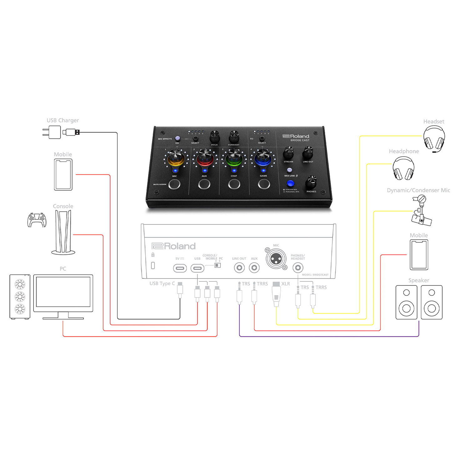 Der Roland Bridge Cast ist eine Komplettlösung mit professionellen Sounds für Profi-Gamer. Parallele Soundmischungen, Vocal-Transformer-Effekte, Musikwiedergabe, Soundeffekte sowie die Unterstützung von professionellen Mikrofonen und Kopfhörern - all das wird im Bridge Cast vereint.