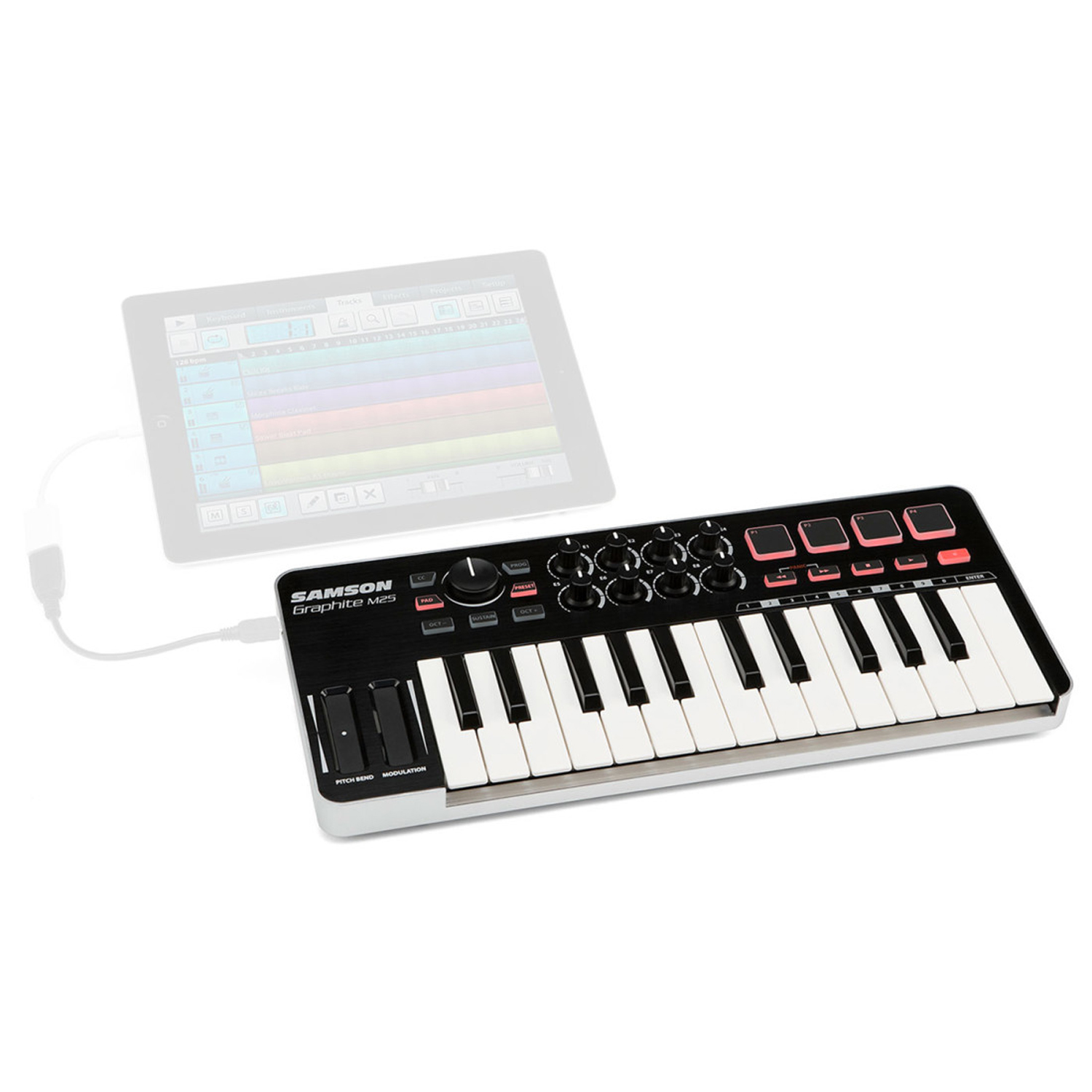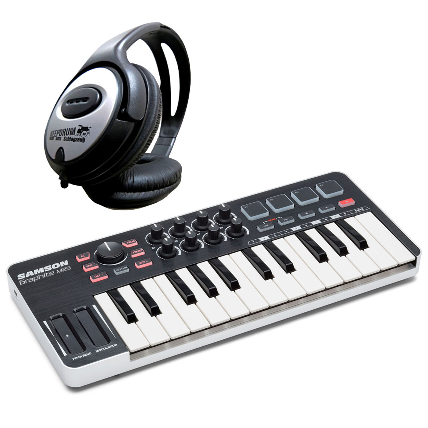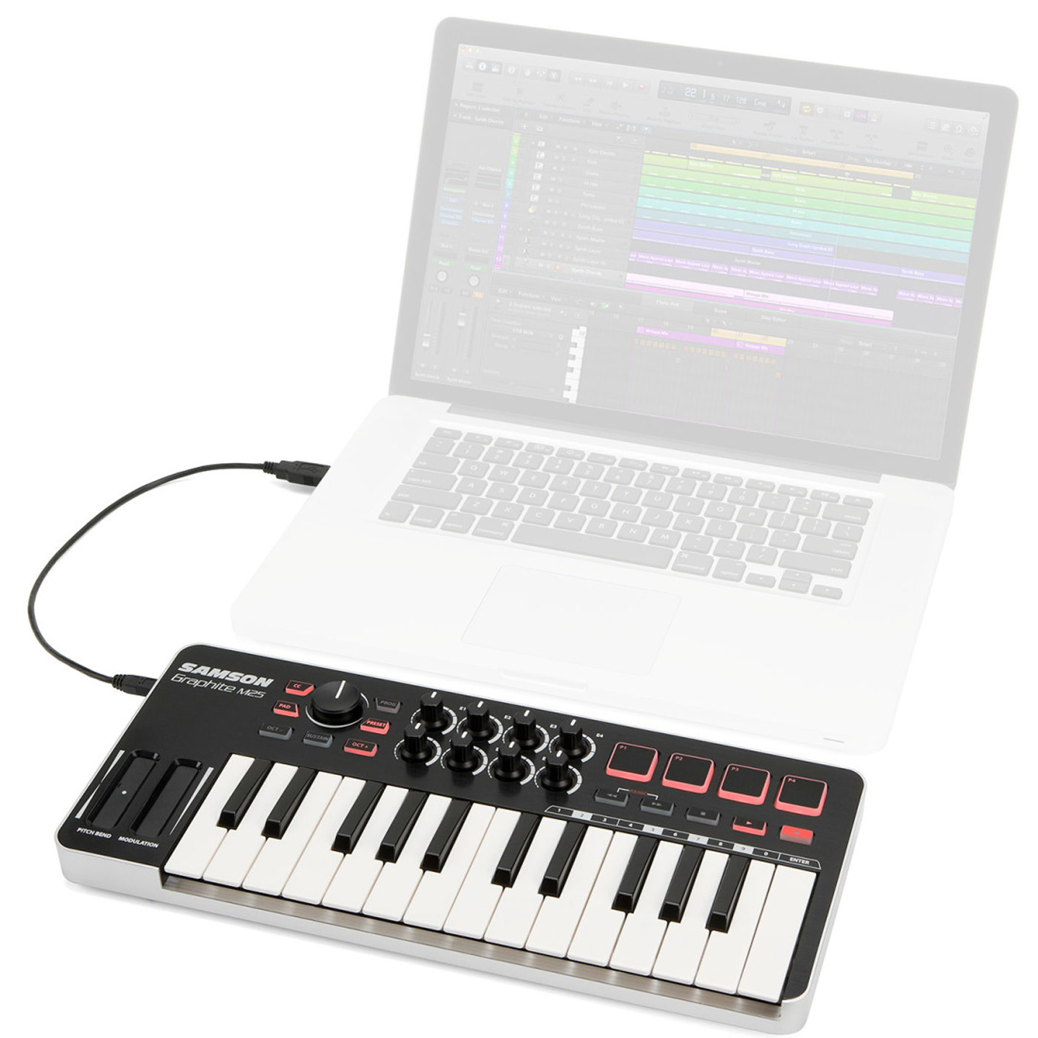 Das Samson Graphite M25 ist ein kompaktes USB Controller-Keyboard das speziell für Musikproduktion entwickelt wurde. Neben der 25 Tasten-Klaviatur bietet der Controller zwei Touch-Strips, ein Datenrad, 8 Dreh-Regler, sowie 4 Trigger-Buttons und eine Transport-Sektion zur Steuerung. Das M25 bietet damit alle relevanten Funktionen die zum Arbeiten mit einer DAW-Software nötig sind in einem kompakten Gerät.