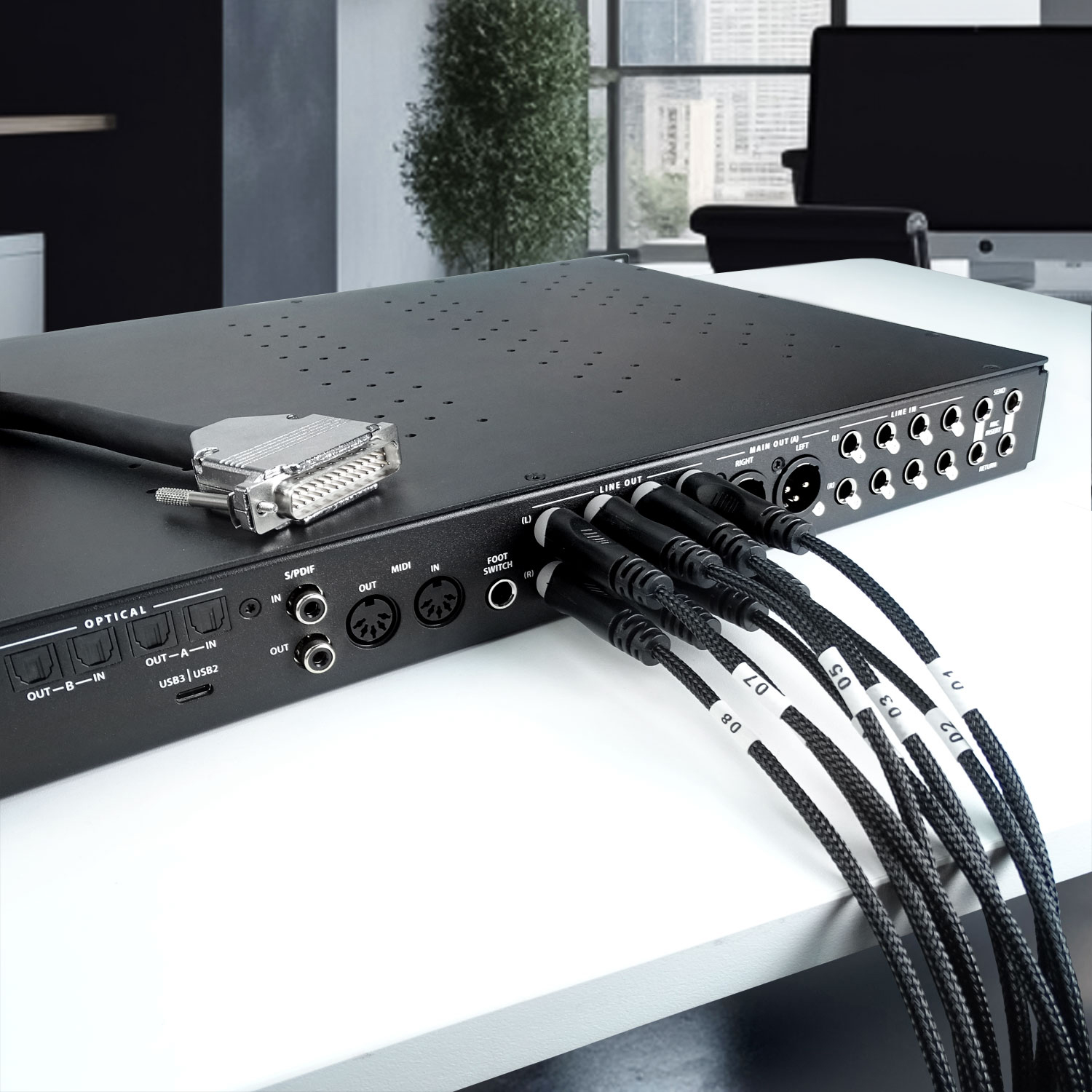 Wie der Name vermuten lässt, verfügen DB-25 Anschlüsse über 25 Pins und sind eine spezielle Bauform von D-Sub-Steckern. Diese Bauweise ist die geläufigste im professionellen Audiobereich und findet sich bei verschiedensten Studiokomponenten.