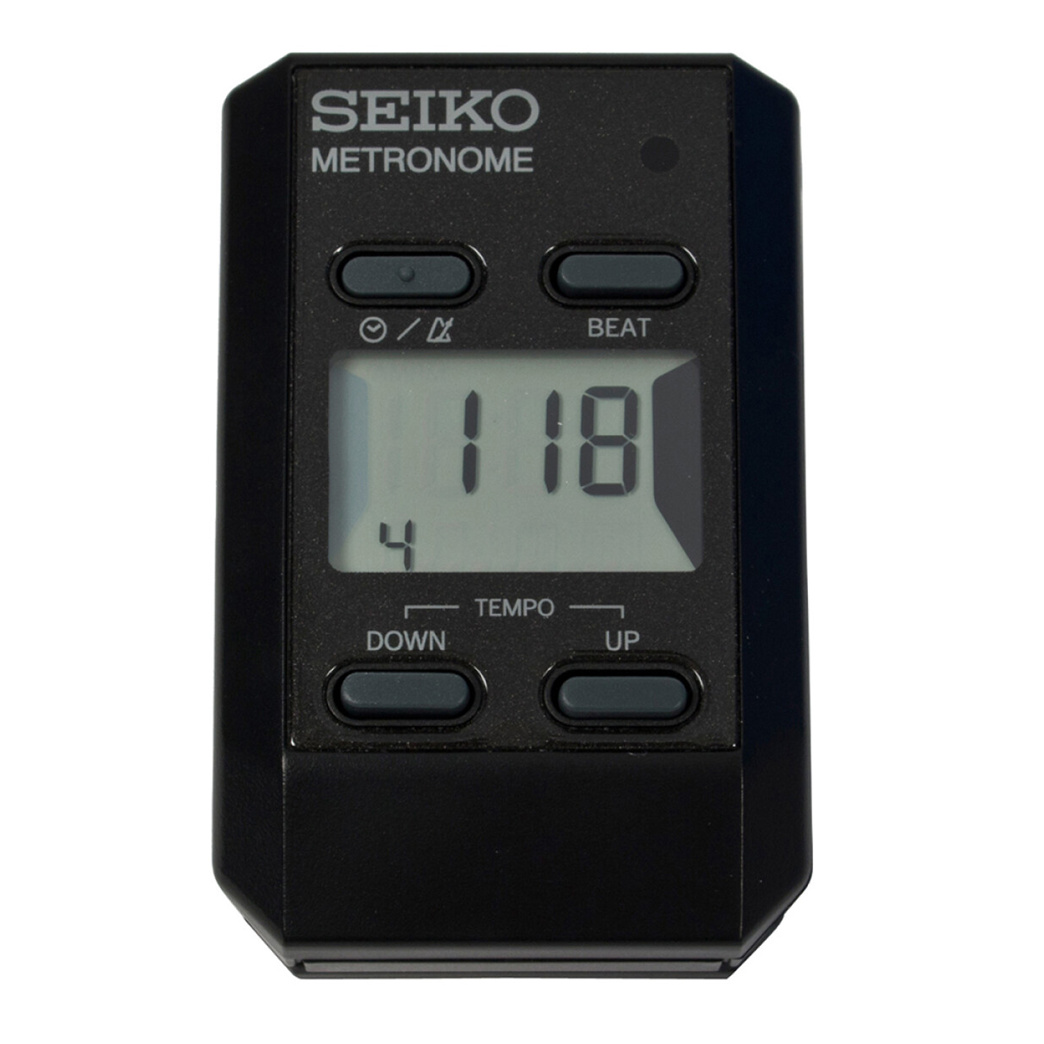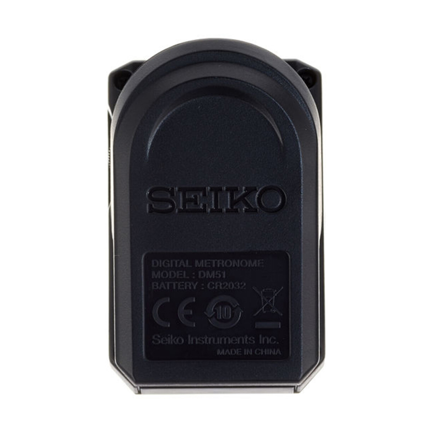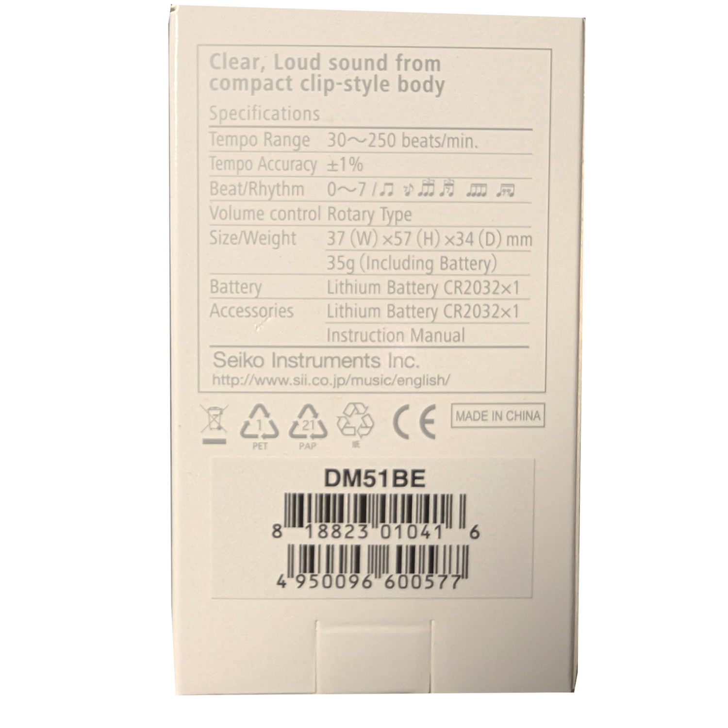 Uhranzeige, was es zu einem nützlichen Alltagsbegleiter für Musiker macht. Das Gerät wird mit einer handelsüblichen CR2032 Knopfzelle betrieben. Mit seinen kompakten Abmessungen von 37 x 57 x 34 mm und einem Gewicht von nur 35 g ist das Seiko DM-51 ein