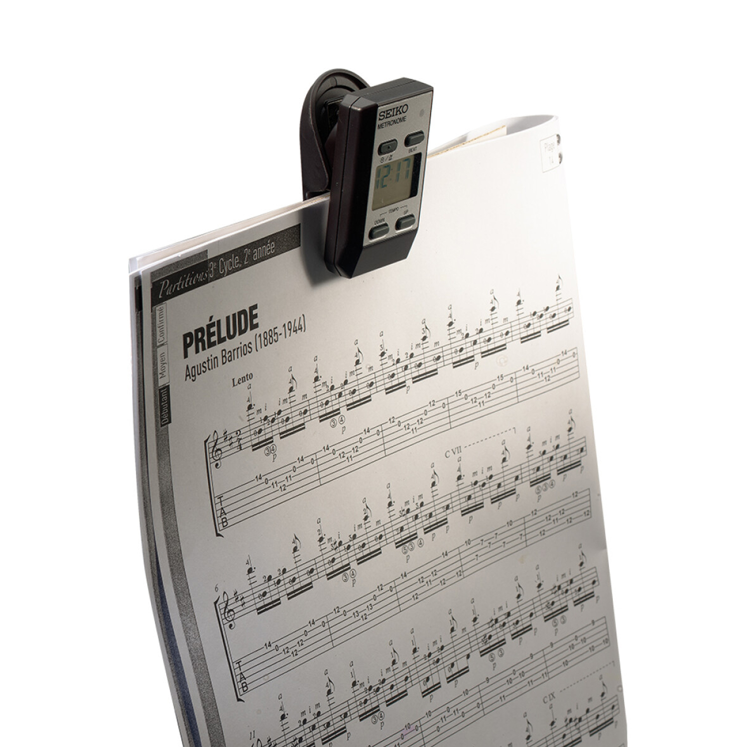 Clip-on-Funktion, die es erlaubt, das Metronom an einem Notenpult, Mikrostativ oder sogar an Kleidung zu befestigen. Dies macht es besonders platzsparend und flexibel im Einsatz. Der eingebaute Lautsprecher sorgt für eine