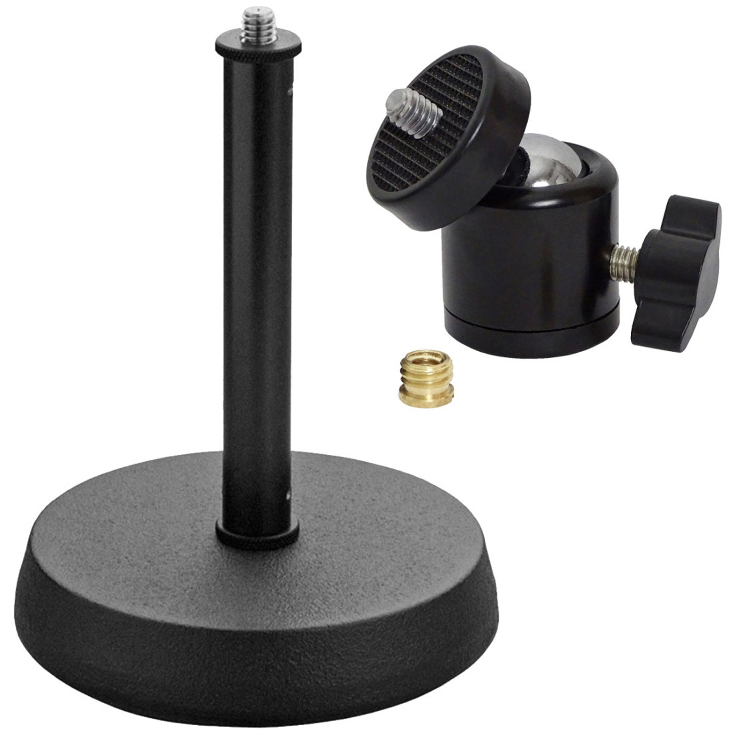 Ein Reduziergewinde von 3/8 Zoll auf 1/4 Zoll ist im Lieferumfang enthalten. Wird dieses mitgelieferte Gewinde oben auf das Kugelgelenk aufgeschraubt, ergibt sich die Kombination 3/8 weiblich zu 3/8 männlich. Damit passt der Kugelgelenk-Adapter auf jeden Standard-Mikrofonständer und kann für Mikrofonklammern und Mikrofone mit 3/8 Gewinde genutzt werden.