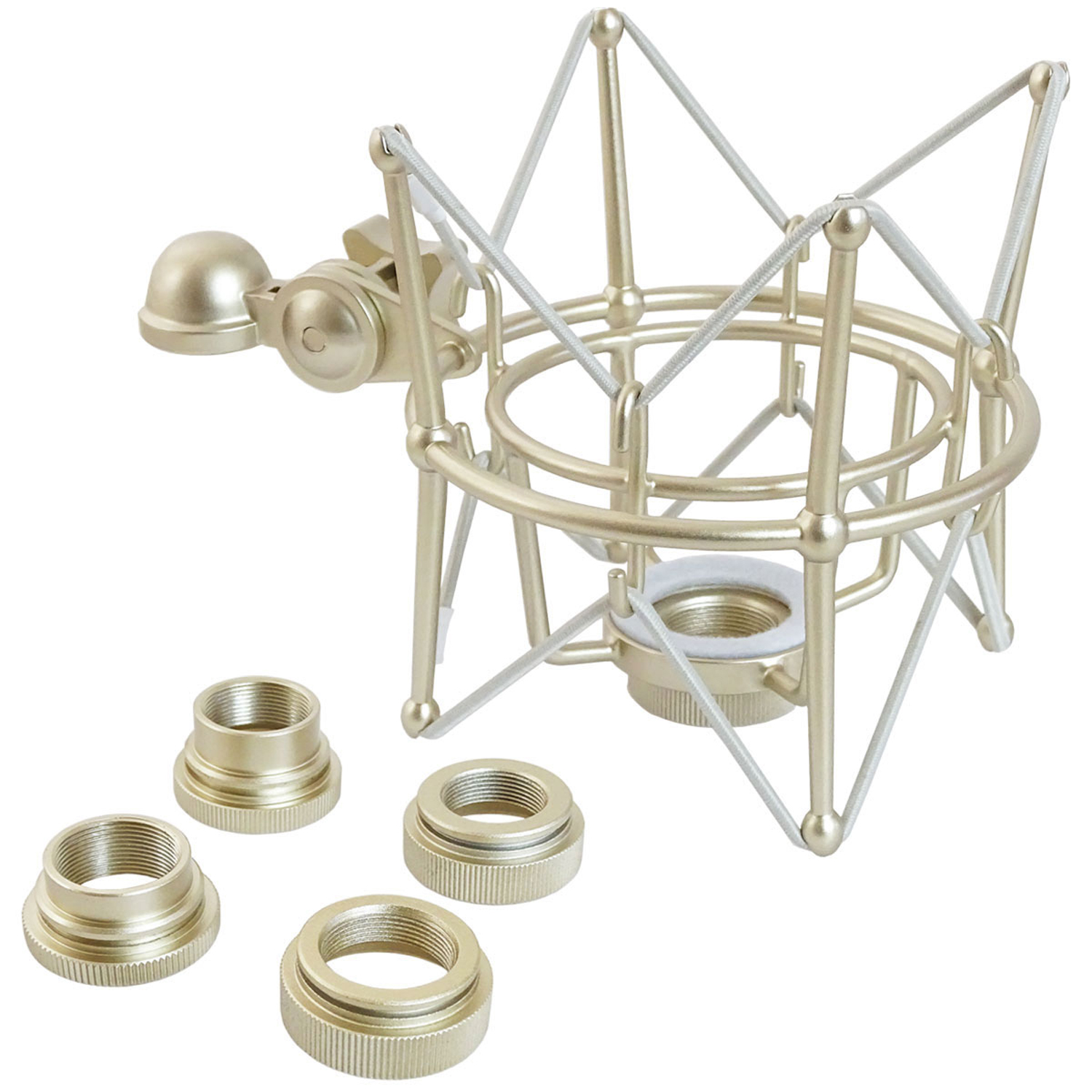 Die Spinne ist ausMetall gefertigt, wobei der freischwingende Mikrofonkorb mitelastischen Bändern fixiert ist. Im Lieferumfang sind 4 einsetzbareGewinde enthalten.