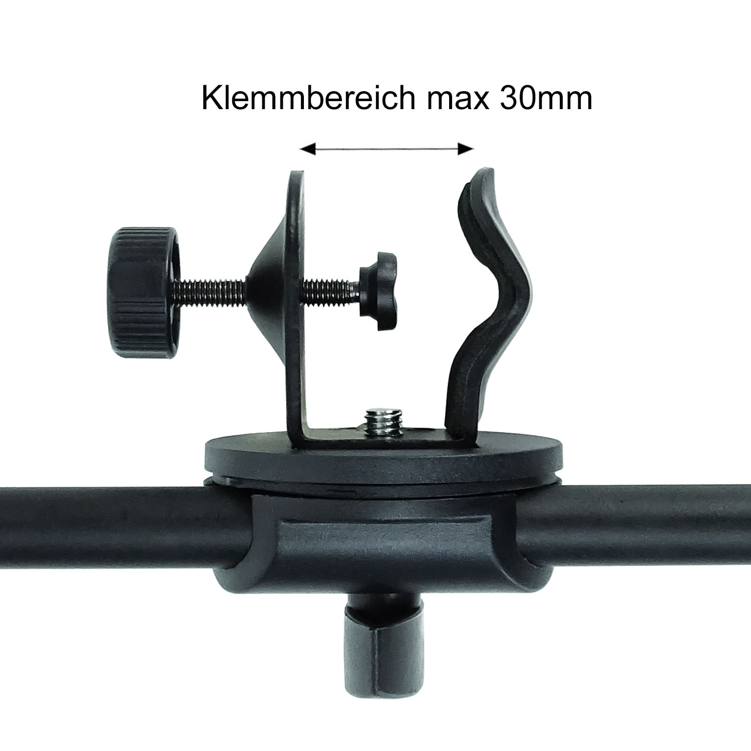 Der Anbau-Galgen hat eine Gesamtlänge von 57cm und damit eine maximale Reichweite von 45cm. Die gewünschte Länge des Arms lässt sich über die große Flügelmutter bequem einstellen und zuverlässig fixieren. Der Neigungswinkel des Stativ-Arms ist frei einstellbar und lässt sich im kompletten Bereich von 360 Grad stufenlos einstellen.