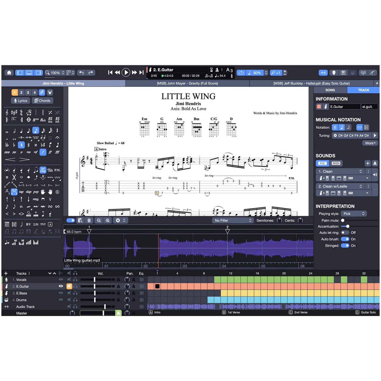 Die Notationssoftware Guitar Pro 8 von Arobas ist eine umfangreiche Tabulatur-Editor-Software für Gitarre und weitere Saiteninstrumente, die sich für Anfänger sowie für Profis eignet. Angefangen bei der Erstellung von Partituren bietet Guitar Pro viele Funktionen, mit denen sowohl Anfänger wie auch erfahrene Musiker ihre instrumentalen Fähigkeiten verbessern, eigene Songs komponieren oder auf mehreren Spuren eine Band zur Begleitung zusammenstellen können, die das Üben unterstützt.