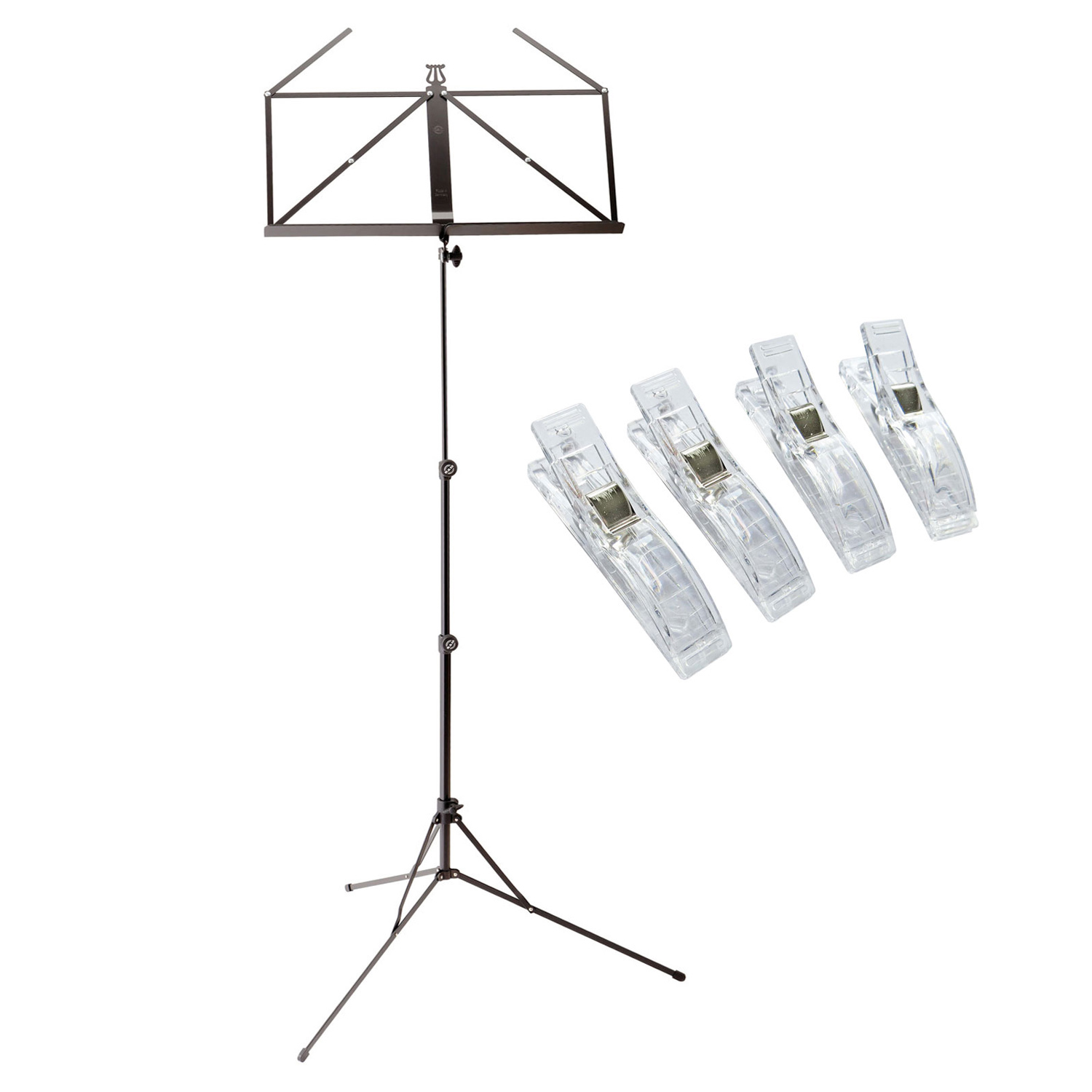 Das Stativ ist in der Höhe 2-fach ausziehbar von 650-125mm. Die Notenauflage bietet mit 440x215mm genügend Platz für Notenblätter, Notenhefte oder schmale Ordner. Der Winkel der Notenablage kann nach Wunsch eingestellt werden. Mit den zwei ausklappbaren Blatthaltern fixieren SieIhre Noten schnell und einfach.