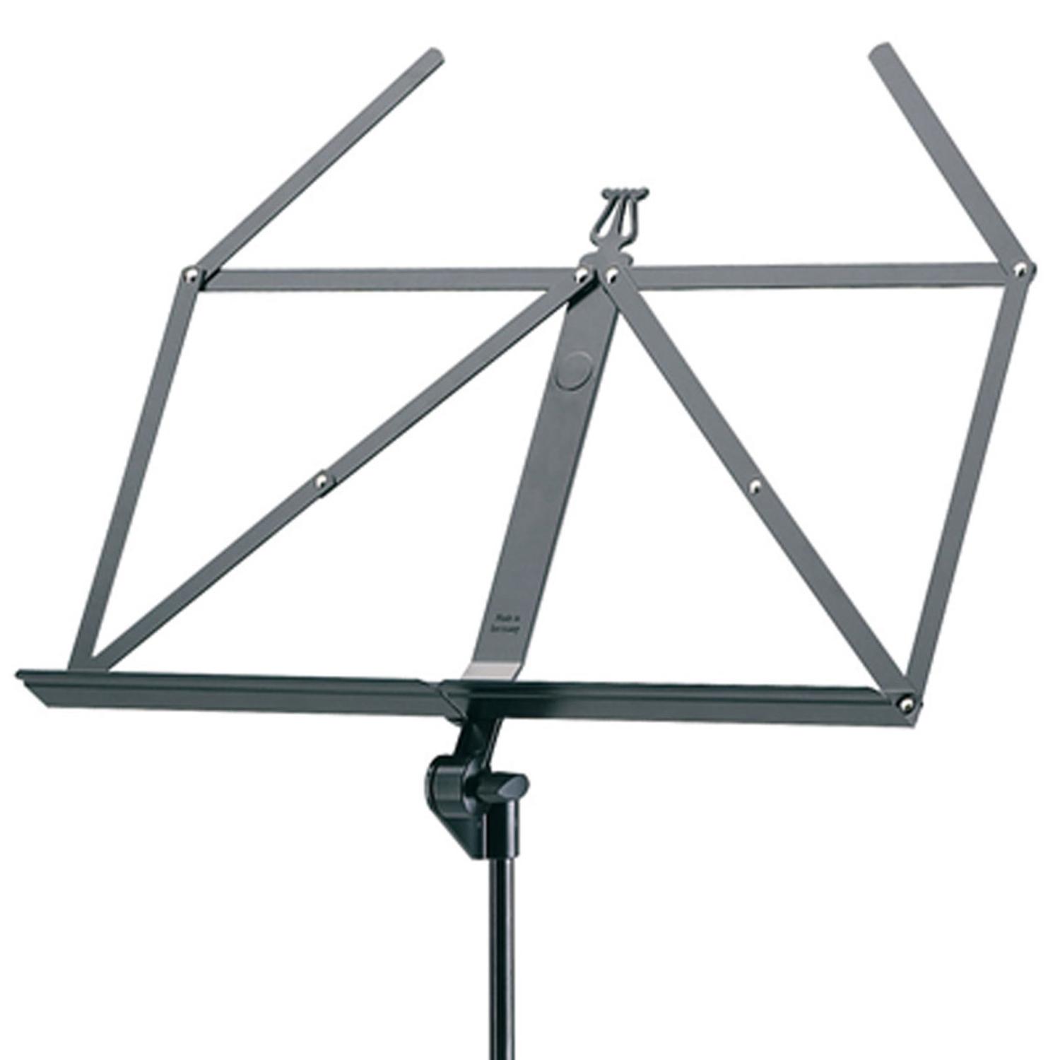 Die Notenablage hat die Maße von 485 x 240 x 42 mm und bietet genügend Platz zur Ablage von Notenblättern und Ordnern. Der Notenpult ist aus Stahl gefertigt und bietet durch seine dreibeinige Strebenkonstruktion zuverlässigen Stand. Große Parkettschoner und die äußerst stabile Fußkonstruktion verleihen dem Stativ seine außergewöhnliche Standsicherheit.