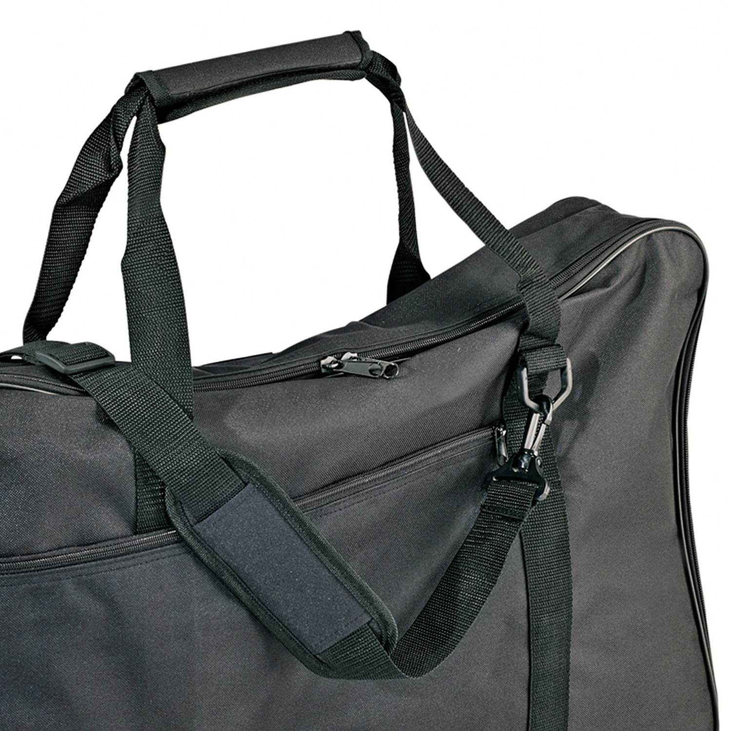 Die Tasche besteht aus reißfestem Nylongewebe und ist wasserabweisend. Die Tasche kann sowohl mit der Hand an den Trageschlaufen oder über den abnehmbaren Umhängeriemen getragen werden.