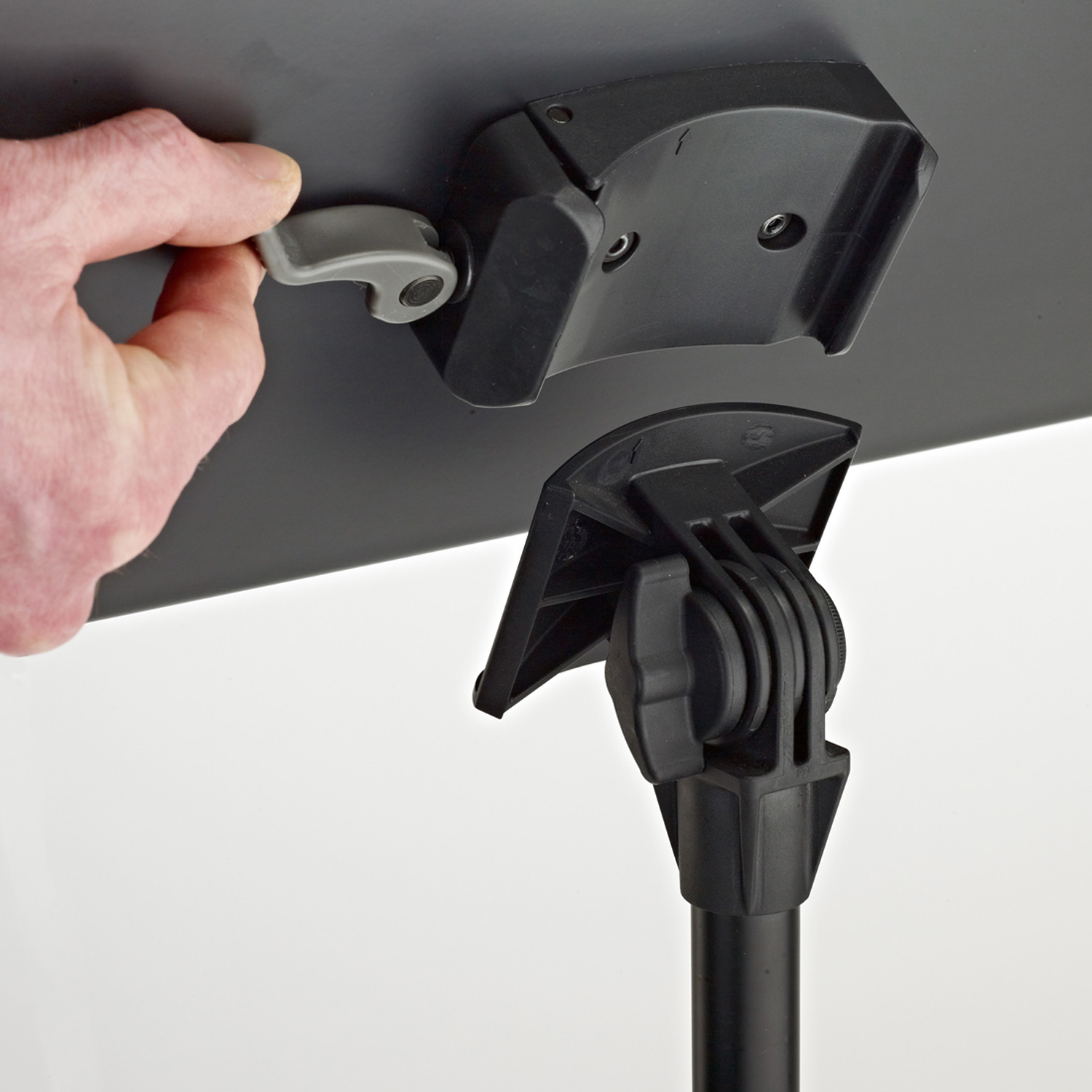 Das K-M 11870 ist ein pulverbeschichtetes Aluminium-Notenpult mit Stahlplatte. Die Notenpultplatte wird mit einem leicht zu bedienenden Schnellverschluss am Stativ befestigt bzw. wieder gelöst.