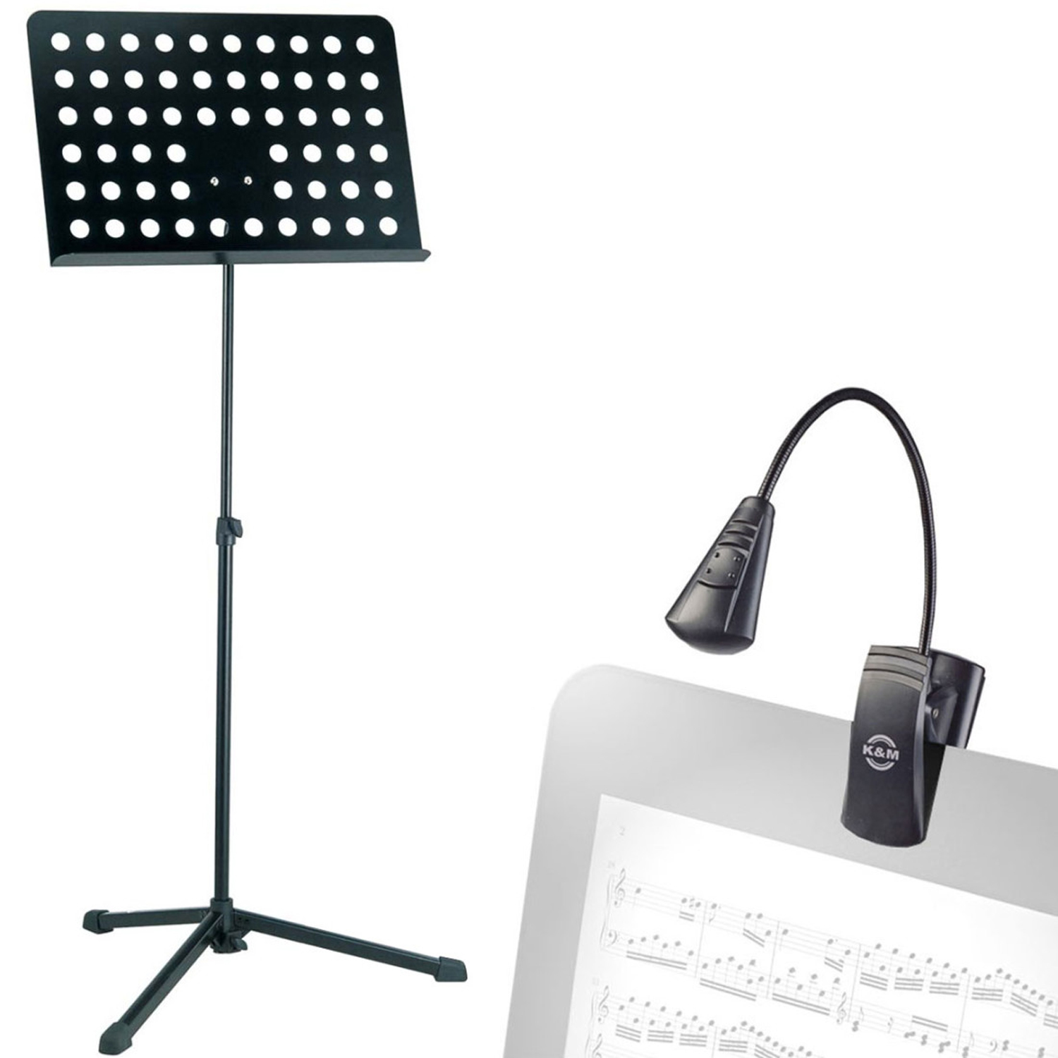 Die LED-Notenleuchte 12241 von K&M ist eine batteriebetriebene LED-Leuchte mit flexiblem Schwanenhals, die sich per Clip an einem Notenständer befestigen lässt.