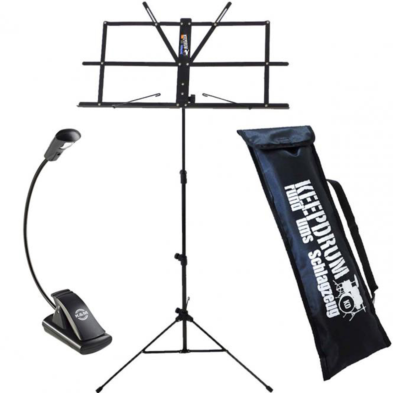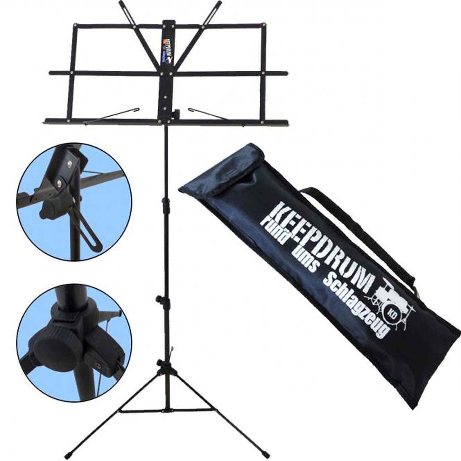 Der keepdrum MUS2 Notenständer ist speziell für Kinder gedacht da er sehr einfach aufzubauen ist. Die Notenauflage kann bei diesem Modell mit einer einzigen Bewegung aufgeklappt werden. Der Notenständer ist robust gebaut und hat dabei lediglich ein Gewicht von 1kg. Die Höhe ist von 650-1350mm einstellbar. Für den Transport zum Musikunterricht wird eine gepolsterte Tragetasche mit Tragegurt mitgeliefert.