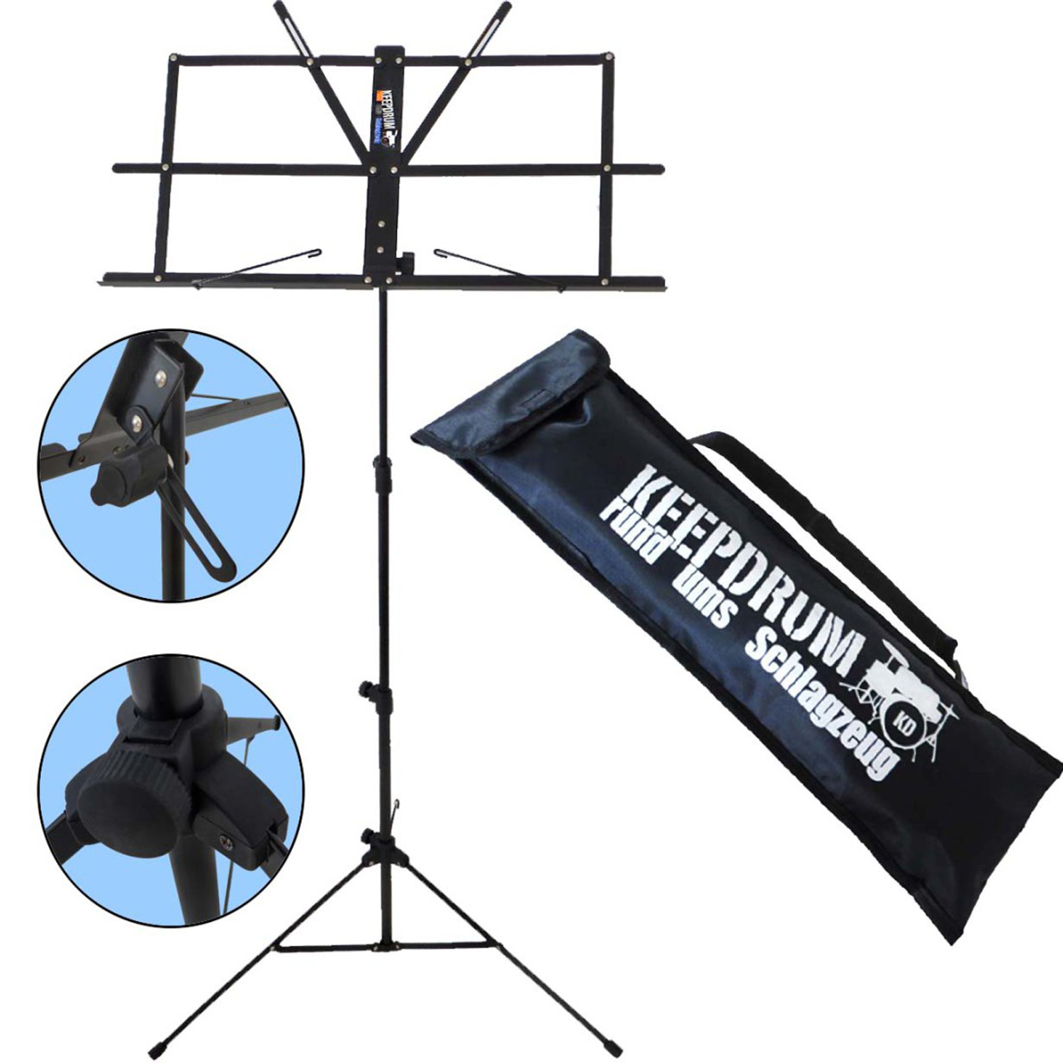 Der Notenständer ist robust gebaut und hat dabei lediglich ein Gewicht von 1kg. Die Höhe ist von 650-1350mm einstellbar. Für den Transport zum Musikunterricht wird eine gepolsterte Tragetasche mit Tragegurt mitgeliefert.