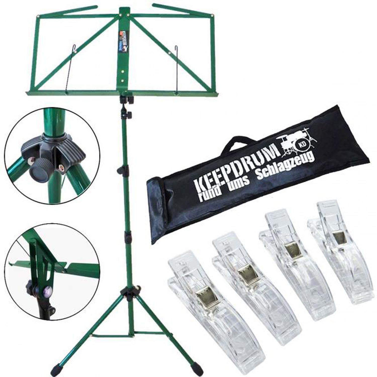 keepdrum MUS3GR Notenpult Grün mit 4 Notenklammern