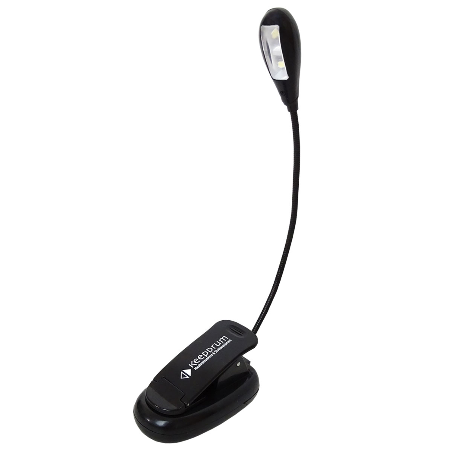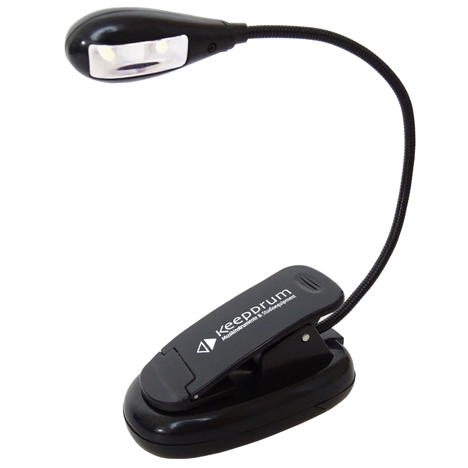 Die keepdrum Notenpult-Leuchte ist eine flexible LED-Lampe mit zwei Helligkeitsstufen, die durch ihre Halteklammer mit einem Handgriff befestigt werden kann.
