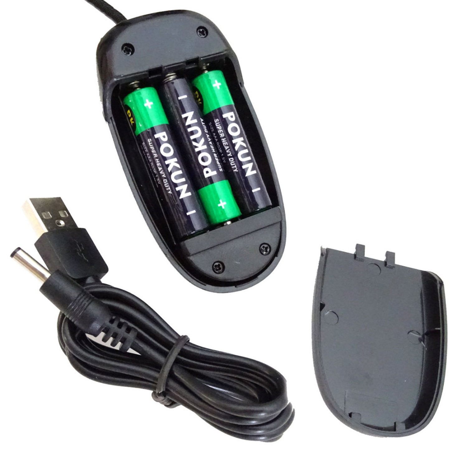 Sie kann mit 3 AAA Batterien betrieben werden oder über ein USB-Kabel mit Strom versorgt werden.