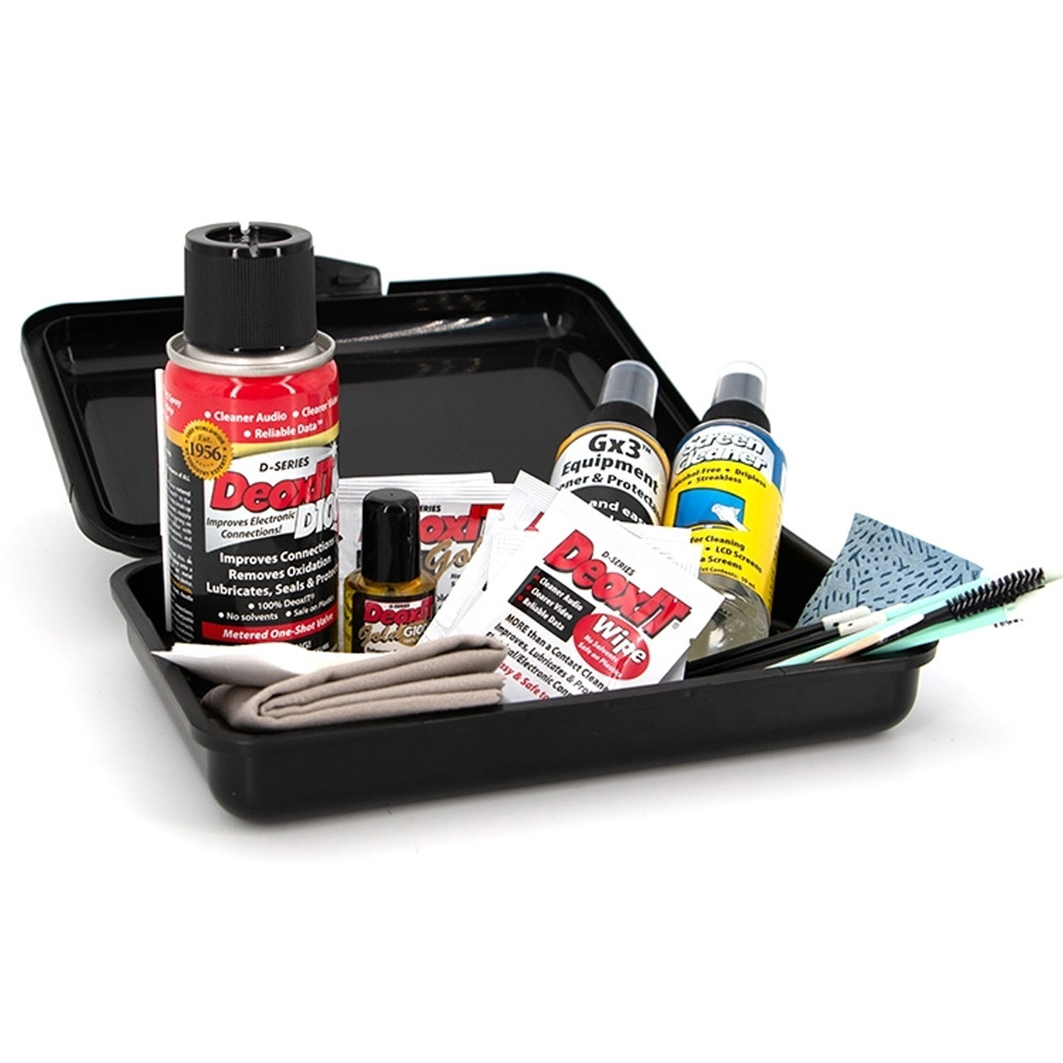 Das Deoxit SK-AV35 von Caig Laboratories ist ein Pflegeset für Audio- und Videogeräte. Das Kit enthält mehrere Mini-Sprays, Flüssigkeiten sowie fusselfreie Tupfer, Bürsten und Tücher.