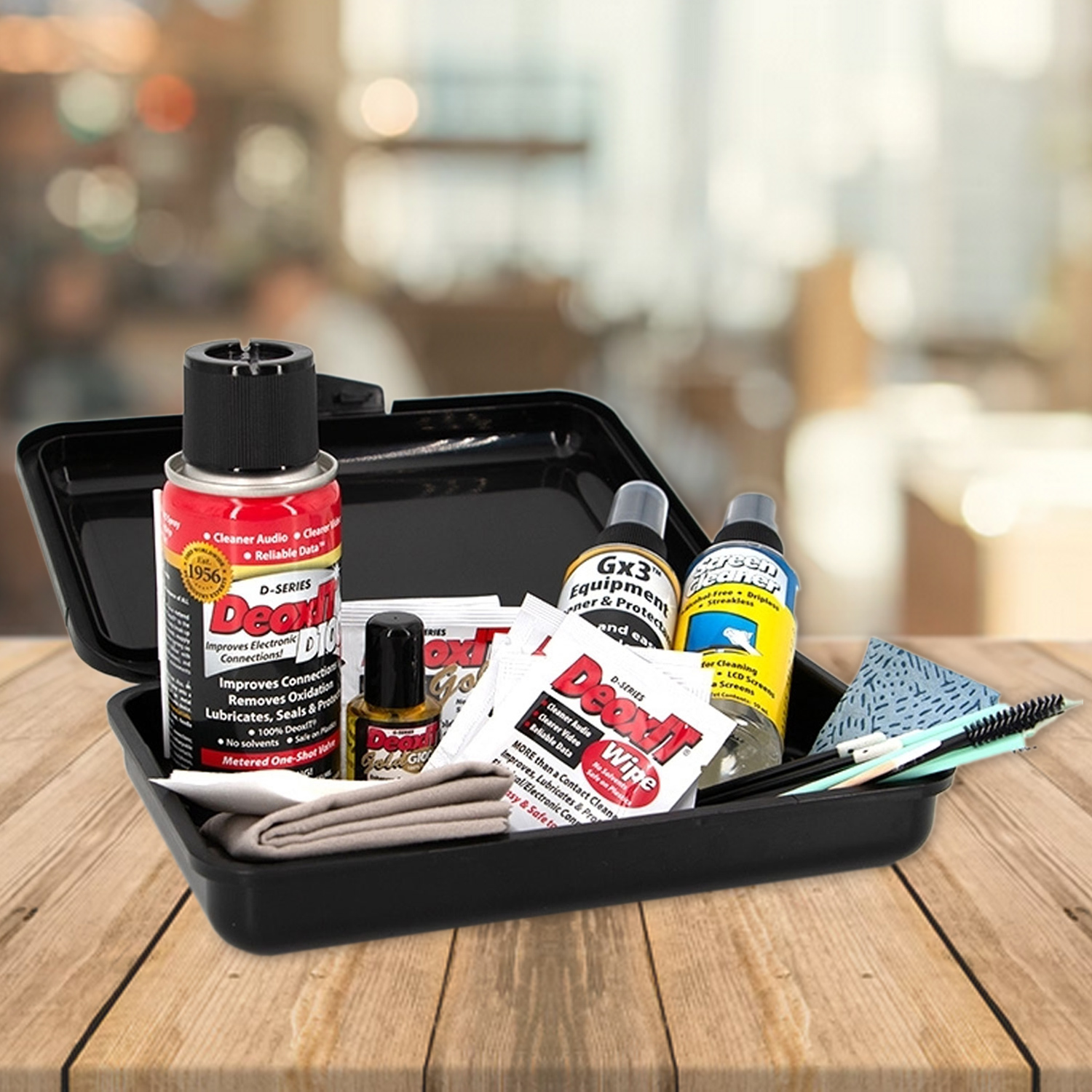 Im Kit enthalten sind zwei Sprays (CL-ECP-02, CCS-502) mit einem Inhalt von je 59 ml, mit denen sich Bildschirme sowie Oberflächen von elektronischem Equipment reinigen und schüzen lassen. Zudem ist das D100-S2 Kontaktreiniger-Spray enthalten, des elektronische Kontakte reinigt, schützt und verbessert. Ein G100L Pinselfläschchen zur Anwendung bei Edelmetallkontakten, fusselfreie Tupfer, Bürsten und Tücher komplettieren das Set.Im Lieferumfang enthalten ist zudem eine praktische Aufbewahrungsbox, die man zu jedem Einsatz mitnehmen kann. Lieferumfang: