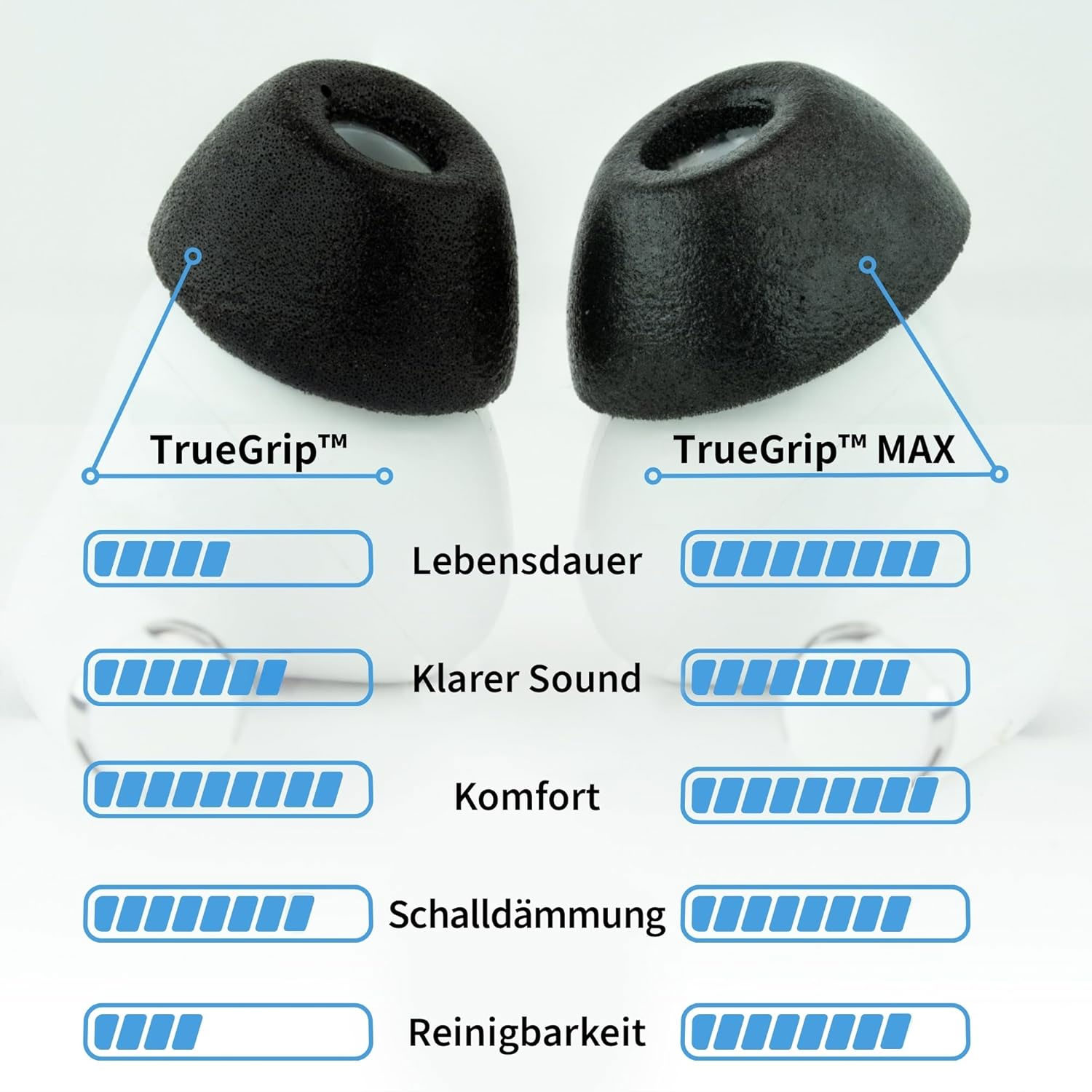 Truegrip Max Schaumstoffaufsätze sind im Gegensatz zu der Standard-Version beschichtet und verwenden ein hochwertigeres Material. Dadurch liefern Sie noch besseren Halt, bessere Abdichtung und sind weniger anfällig für Verschmutzungen.