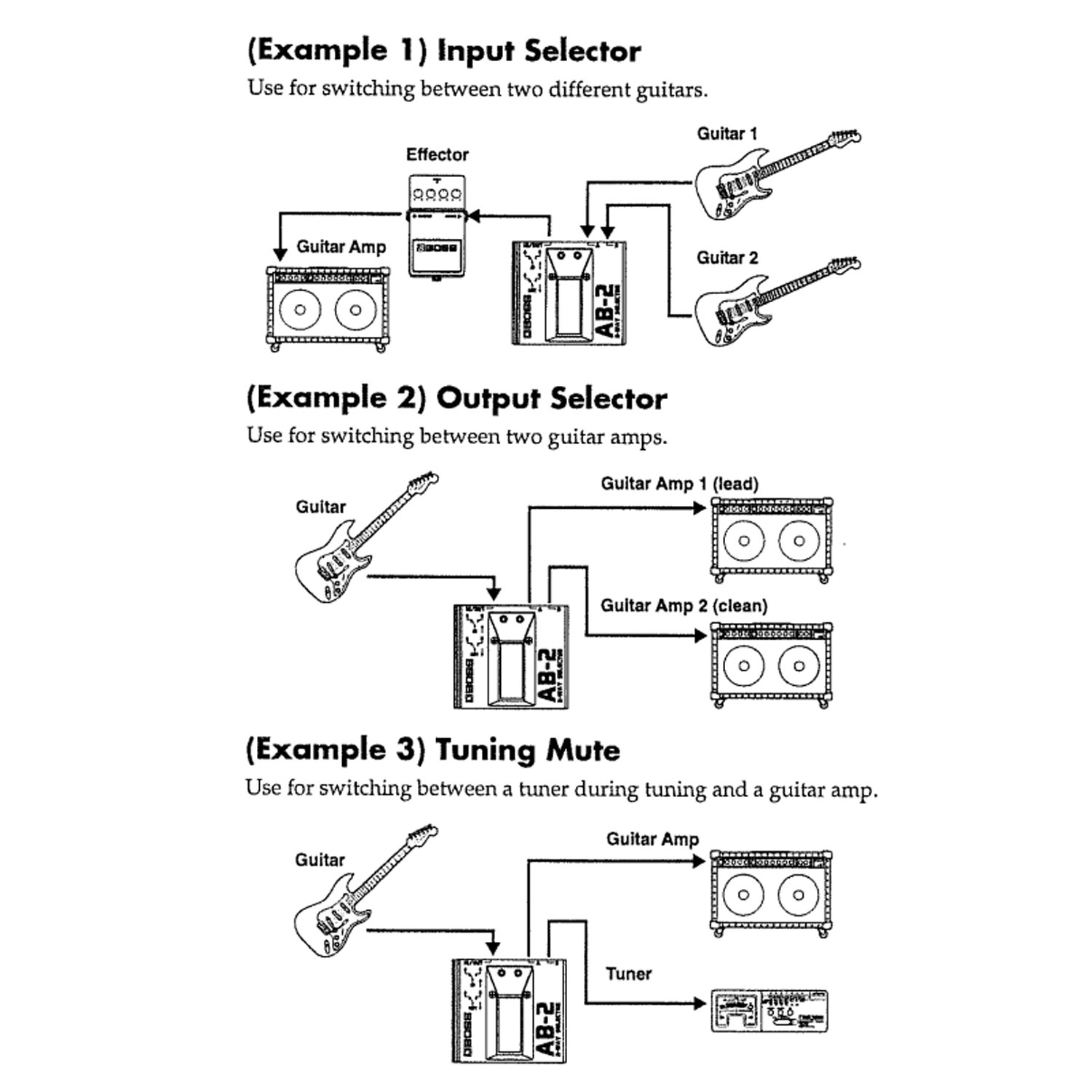 Das Prinzip funktioniert auch in der anderen Richtung - der AB-2 Schalter ermöglicht es auch eine Gitarre zu spielen und mit dem Schalter zwischen zwei Verstärkern zu wechseln.
