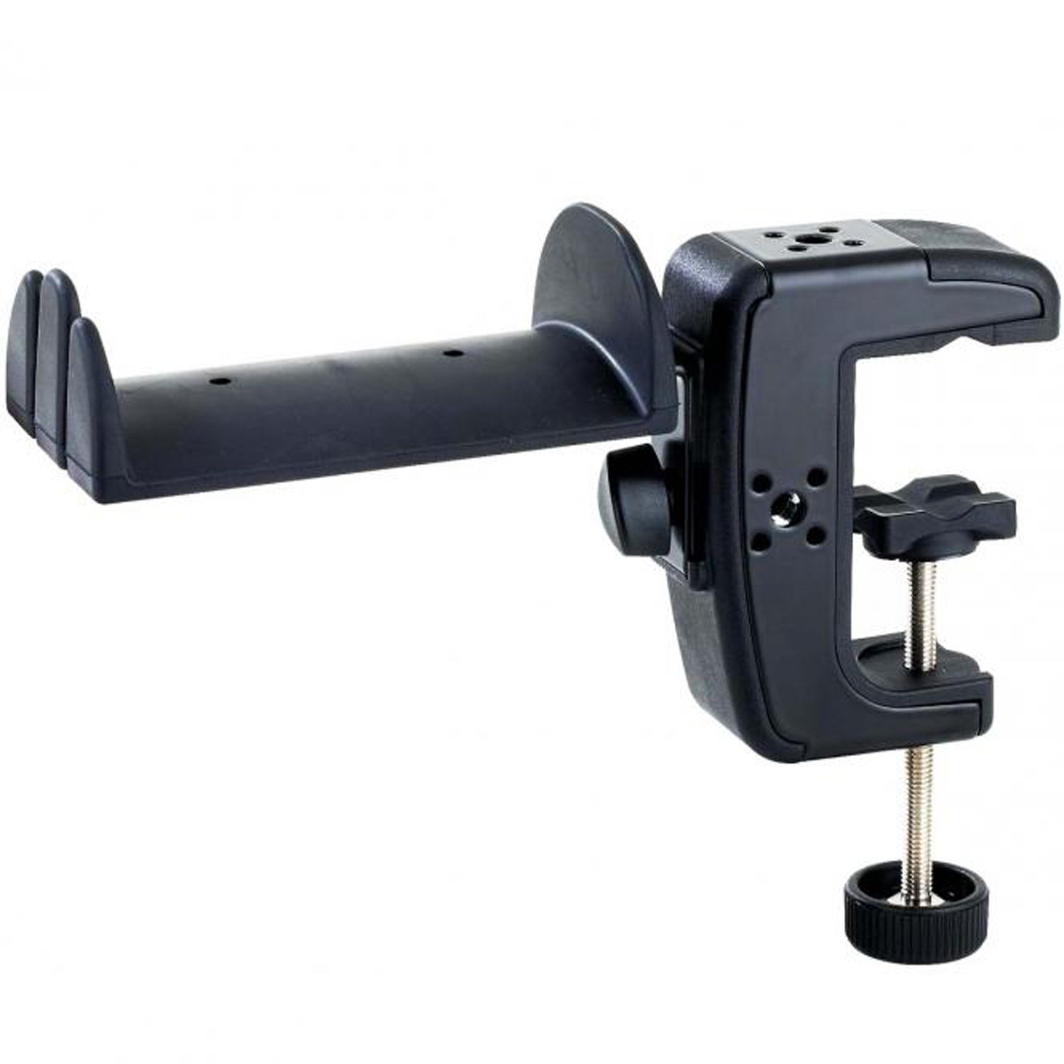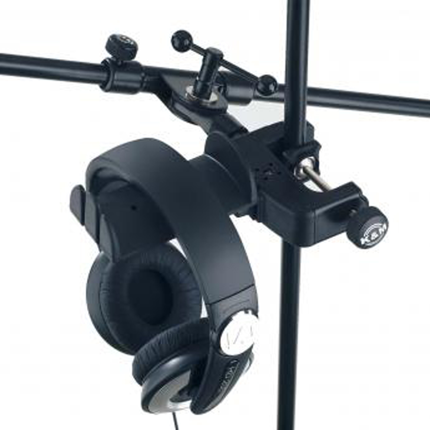 Die weiche gummierte Auflage kann problemlos 2 Standard Kopfhörer aufnehmen. Zusätzlich können an der geschlitzten Stirnseite 2 In-Ear-Kopfhörer bequem eingehängt werden. Der Kopfhörerhalter kann mittels einer Klemmschraube in vier verschiedene Richtungen befestigt werden.
