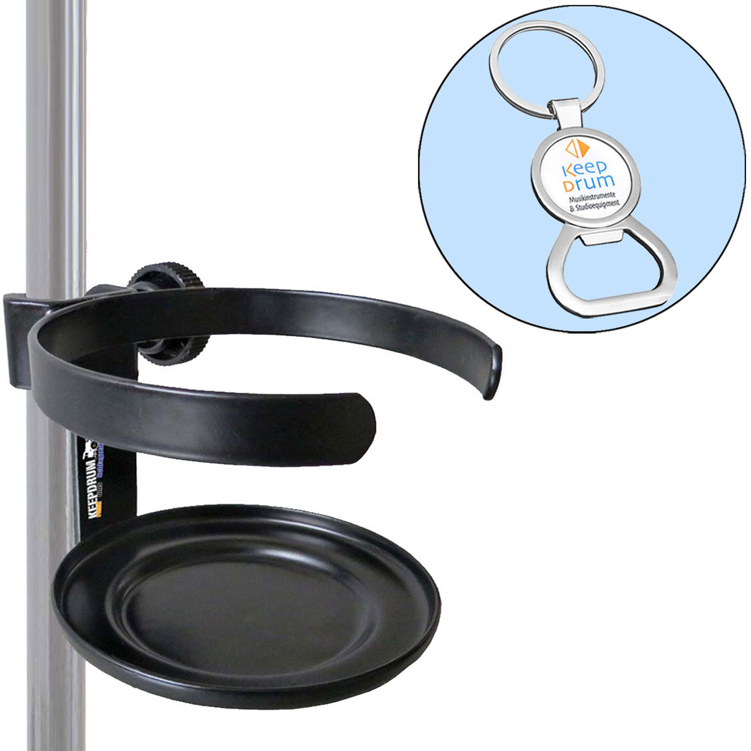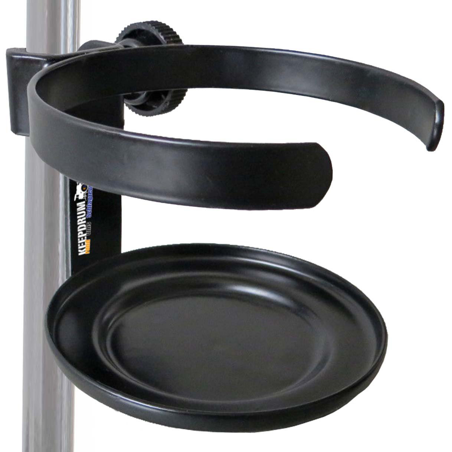 Der keepdrum Drinkholder ist ein anschraubbarer Getränkehalter der an Mikrofonständer sowie Notenständer mit einem maximalen Rohrdurchmesser von 20mm angeschraubt werden kann. Er bietet eine stabile Abstellmöglichkeit für Flaschen,Gläser und Tassen.